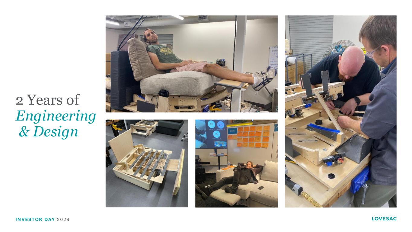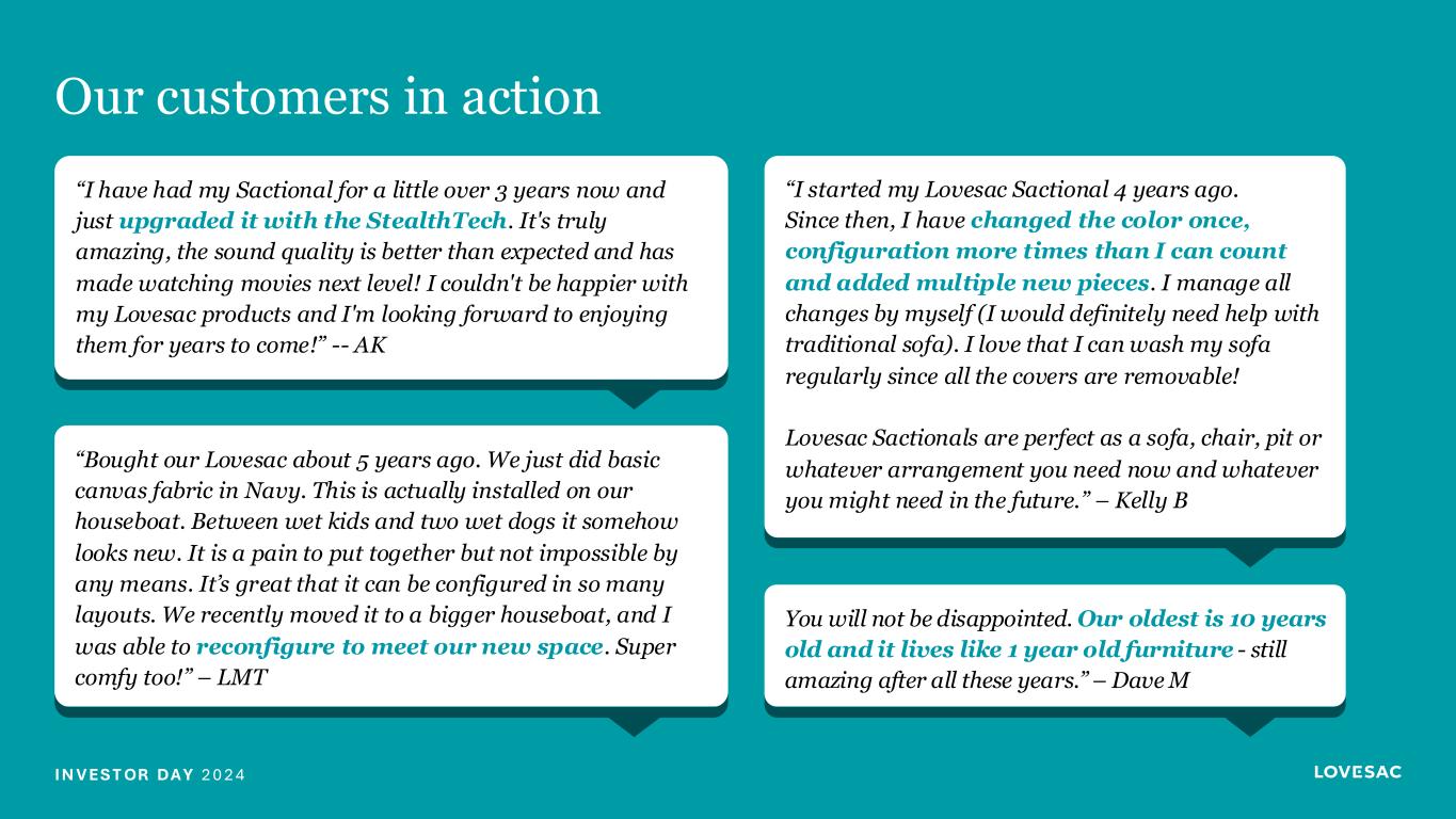 I N V ES T OR DA Y 2 0 2 4 “I have had my Sactional for a little over 3 years now and just upgraded it with the StealthTech. It's truly amazing, the sound quality is better than expected and has made watching movies next level! I couldn't be happier with my Lovesac products and I'm looking forward to enjoying them for years to come!” -- AK “Bought our Lovesac about 5 years ago. We just did basic canvas fabric in Navy. This is actually installed on our houseboat. Between wet kids and two wet dogs it somehow looks new. It is a pain to put together but not impossible by any means. It’s great that it can be configured in so many layouts. We recently moved it to a bigger houseboat, and I was able to reconfigure to meet our new space. Super comfy too!” – LMT “I started my Lovesac Sactional 4 years ago. Since then, I have changed the color once, configuration more times than I can count and added multiple new pieces. I manage all changes by myself (I would definitely need help with traditional sofa). I love that I can wash my sofa regularly since all the covers are removable! Lovesac Sactionals are perfect as a sofa, chair, pit or whatever arrangement you need now and whatever you might need in the future.” – Kelly B You will not be disappointed. Our oldest is 10 years old and it lives like 1 year old furniture - still amazing after all these years.” – Dave M Our customers in action