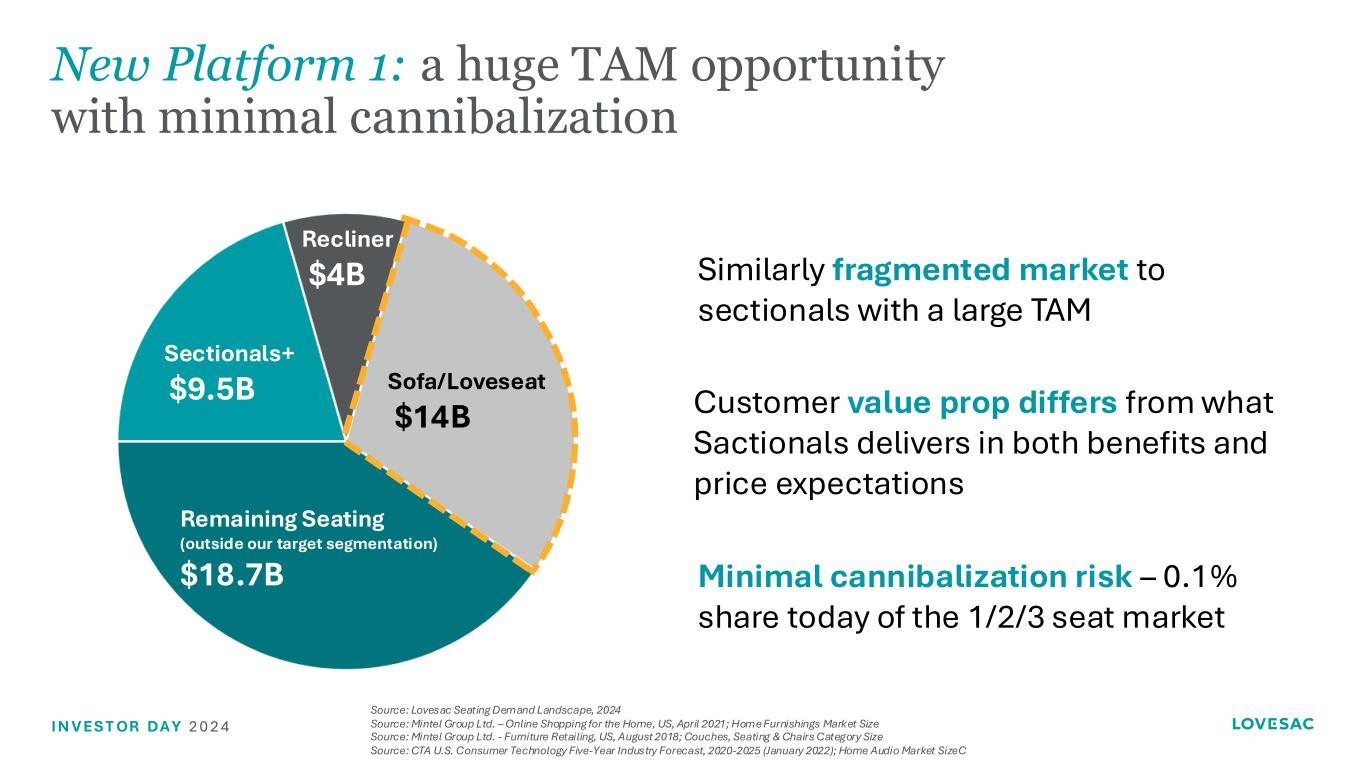 I N V ES T OR DA Y 2 0 2 4 Similarly fragmented market to sectionals with a large TAM Customer value prop differs from what Sactionals delivers in both benefits and price expectations Minimal cannibalization risk – 0.1% share today of the 1/2/3 seat market New Platform 1: a huge TAM opportunity with minimal cannibalization Recliner $4B Sectionals+ $9.5B Sofa/Loveseat $14B Remaining Seating (outside our target segmentation) $18.7B Source: Lovesac Seating Demand Landscape, 2024 Source: Mintel Group Ltd. – Online Shopping for the Home, US, April 2021; Home Furnishings Market Size Source: Mintel Group Ltd. - Furniture Retailing, US, August 2018; Couches, Seating & Chairs Category Size Source: CTA U.S. Consumer Technology Five-Year Industry Forecast, 2020-2025 (January 2022); Home Audio Market SizeC