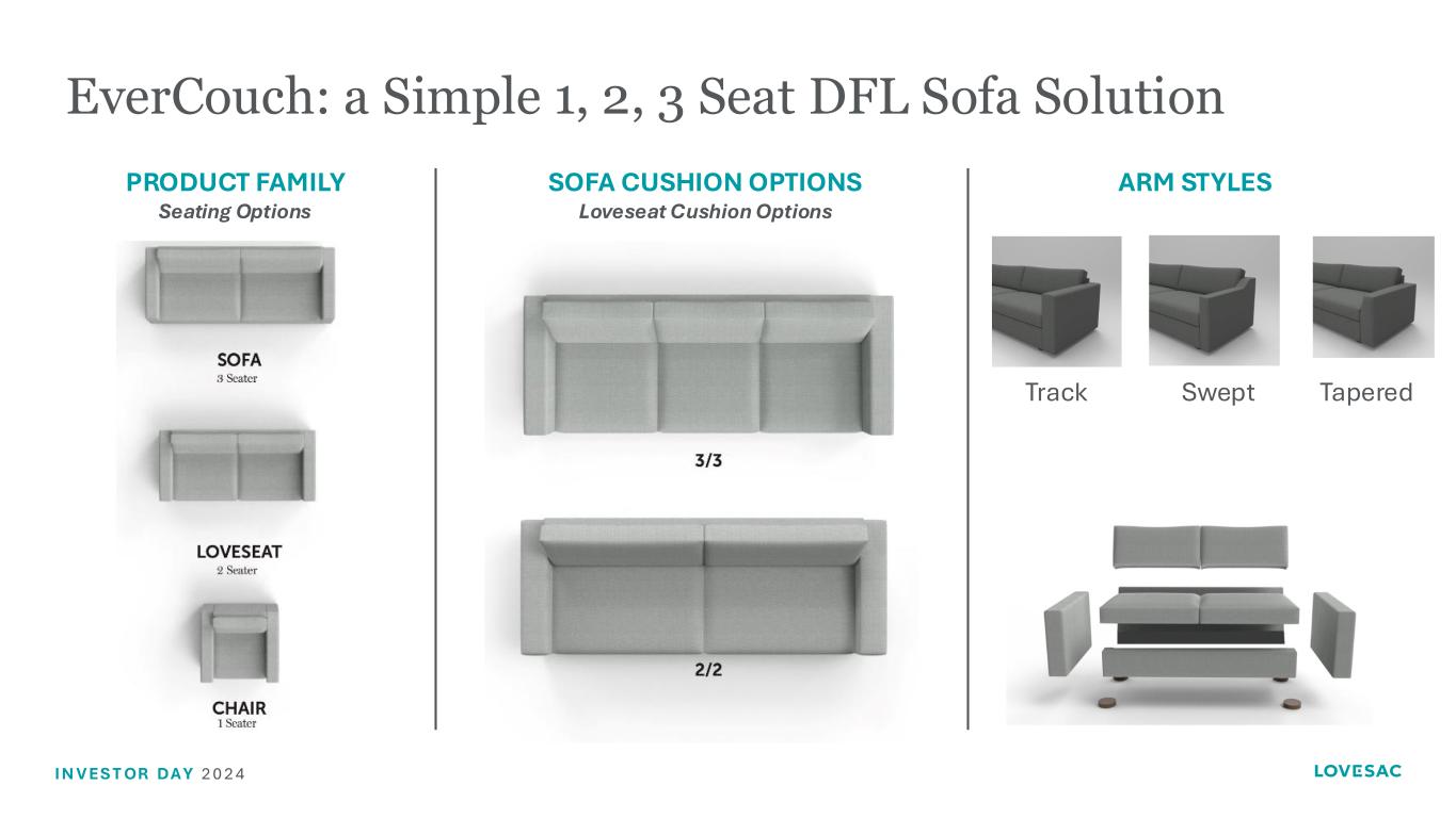 I N V ES T OR DA Y 2 0 2 4 EverCouch: a Simple 1, 2, 3 Seat DFL Sofa Solution SOFA CUSHION OPTIONS Loveseat Cushion Options ARM STYLESPRODUCT FAMILY Seating Options Track Swept Tapered