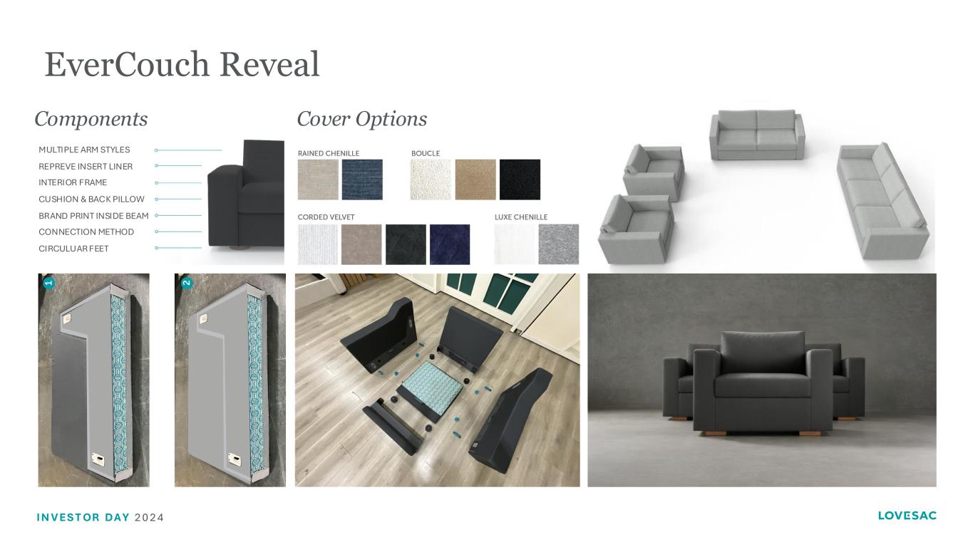 I N V ES T OR DA Y 2 0 2 4 EverCouch Reveal MULTIPLE ARM STYLES REPREVE INSERT LINER INTERIOR FRAME CUSHION & BACK PILLOW BRAND PRINT INSIDE BEAM CONNECTION METHOD CIRCULUAR FEET Cover OptionsComponents