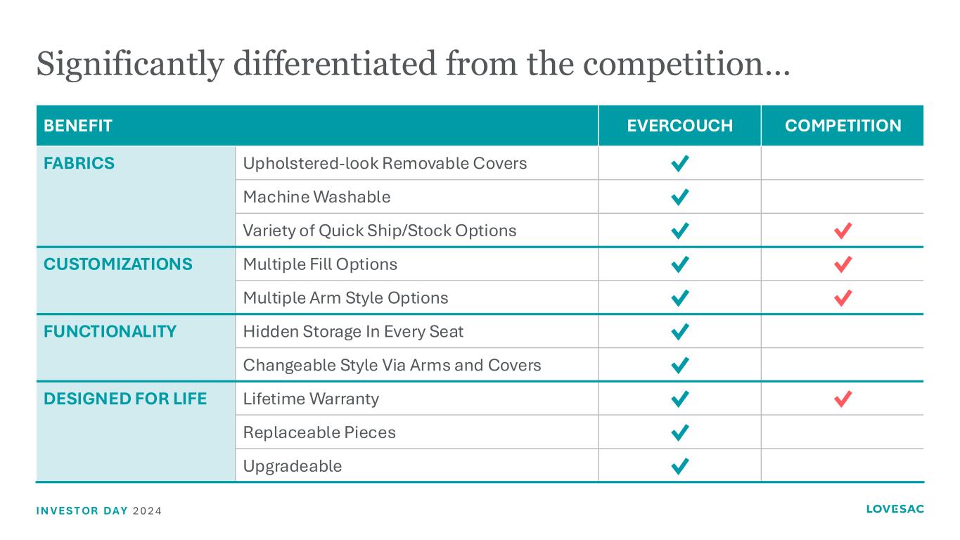 I N V ES T OR DA Y 2 0 2 4 Significantly differentiated from the competition… BENEFIT EVERCOUCH COMPETITION FABRICS Upholstered-look Removable Covers ✓ Machine Washable ✓ Variety of Quick Ship/Stock Options ✓ ✓ CUSTOMIZATIONS Multiple Fill Options ✓ ✓ Multiple Arm Style Options ✓ ✓ FUNCTIONALITY Hidden Storage In Every Seat ✓ Changeable Style Via Arms and Covers ✓ DESIGNED FOR LIFE Lifetime Warranty ✓ ✓ Replaceable Pieces ✓ Upgradeable ✓