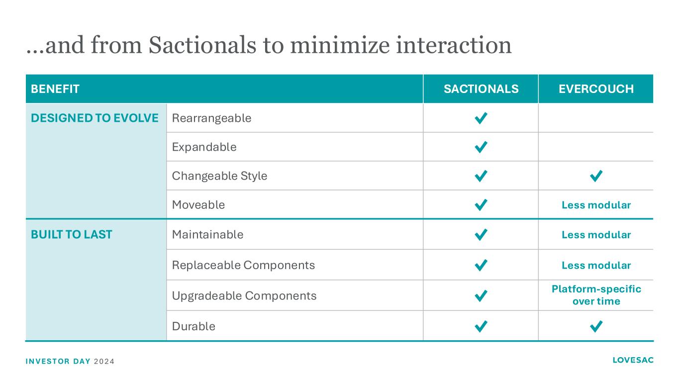I N V ES T OR DA Y 2 0 2 4 …and from Sactionals to minimize interaction BENEFIT SACTIONALS EVERCOUCH DESIGNED TO EVOLVE Rearrangeable ✓ Expandable ✓ Changeable Style ✓ ✓ Moveable ✓ Less modular BUILT TO LAST Maintainable ✓ Less modular Replaceable Components ✓ Less modular Upgradeable Components ✓ Platform-specific over time Durable ✓ ✓