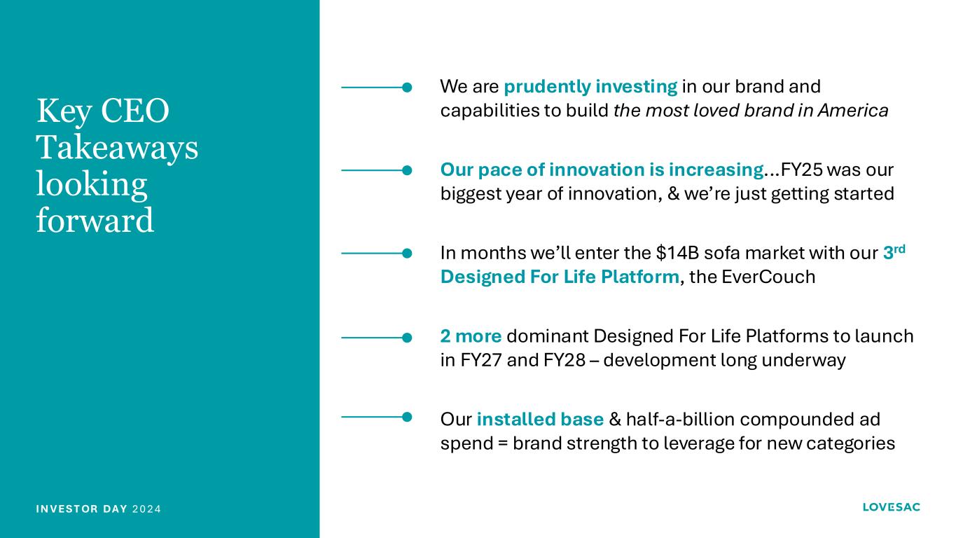 I N V ES T OR DA Y 2 0 2 4 We are prudently investing in our brand and capabilities to build the most loved brand in America 2 more dominant Designed For Life Platforms to launch in FY27 and FY28 – development long underway Our pace of innovation is increasing...FY25 was our biggest year of innovation, & we’re just getting started In months we’ll enter the $14B sofa market with our 3rd Designed For Life Platform, the EverCouch Our installed base & half-a-billion compounded ad spend = brand strength to leverage for new categories Key CEO Takeaways looking forward