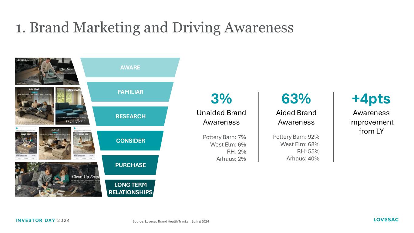 I N V ES T OR DA Y 2 0 2 4 1. Brand Marketing and Driving Awareness RESEARCH FAMILIAR CONSIDER AWARE PURCHASE LONG TERM RELATIONSHIPS 63% Aided Brand Awareness +4pts Awareness improvement from LY Pottery Barn: 92% West Elm: 68% RH: 55% Arhaus: 40% 3% Unaided Brand Awareness Pottery Barn: 7% West Elm: 6% RH: 2% Arhaus: 2% Source: Lovesac Brand Health Tracker, Spring 2024