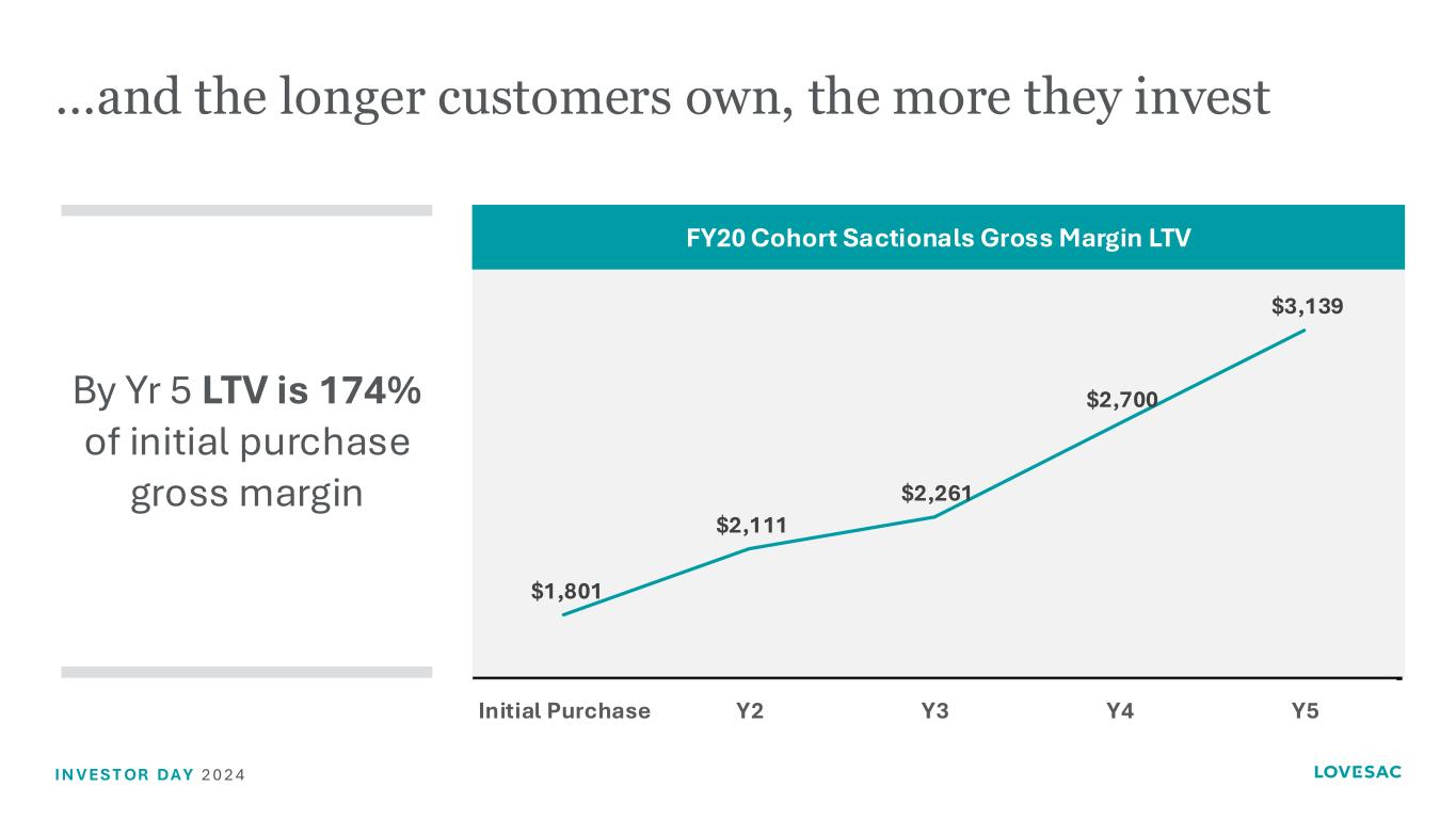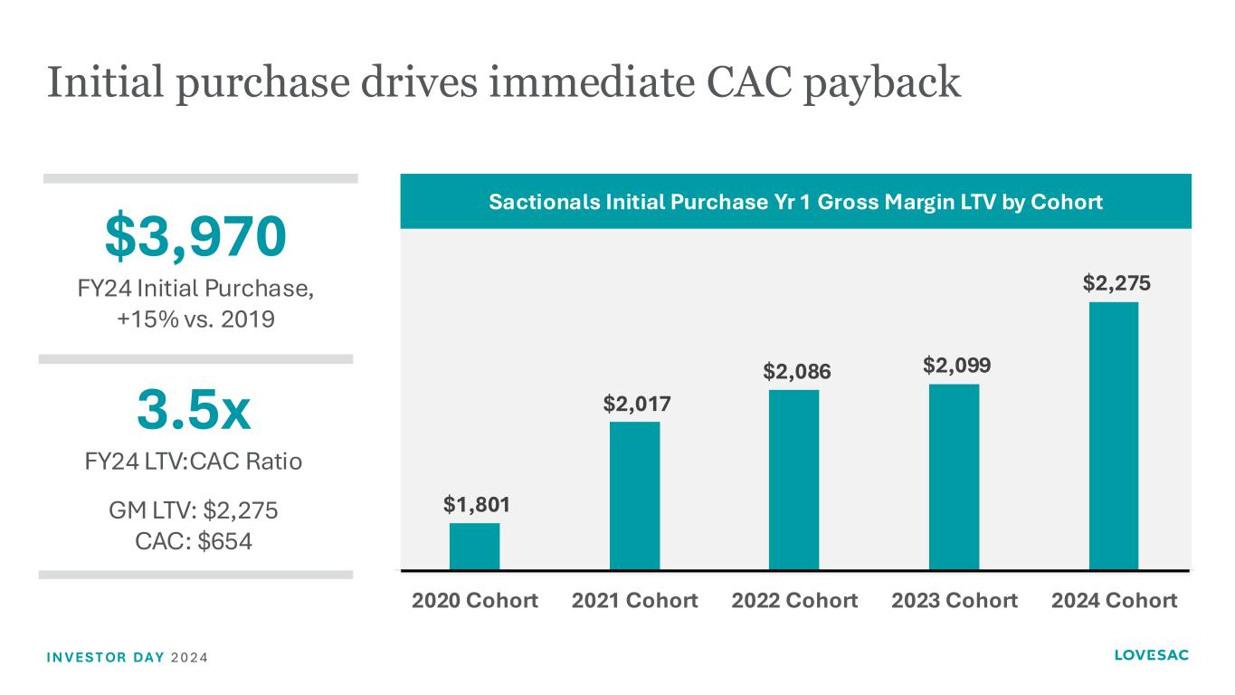 I N V ES T OR DA Y 2 0 2 4 Initial purchase drives immediate CAC payback Sactionals Initial Purchase Yr 1 Gross Margin LTV by Cohort GM LTV: $2,275 CAC: $654 3.5x FY24 LTV:CAC Ratio $1,801 $2,017 $2,086 $2,099 $2,275 2020 Cohort 2021 Cohort 2022 Cohort 2023 Cohort 2024 Cohort $3,970 FY24 Initial Purchase, +15% vs. 2019