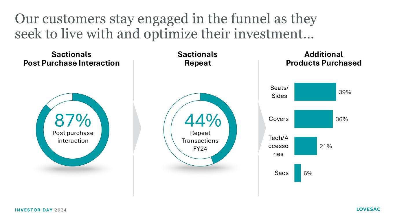 I N V ES T OR DA Y 2 0 2 4 Sactionals Post Purchase Interaction 87% Post purchase interaction 44% Repeat Transactions FY24 39% 36% 21% 6% Seats/ Sides Covers Tech/A ccesso ries Sacs Sactionals Repeat Additional Products Purchased Our customers stay engaged in the funnel as they seek to live with and optimize their investment…