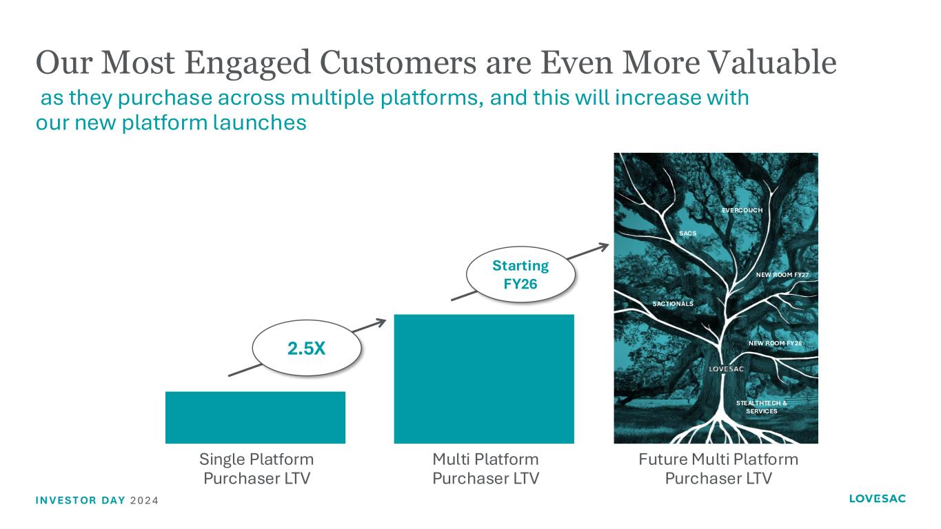 I N V ES T OR DA Y 2 0 2 4 2.5X Starting FY26 Our Most Engaged Customers are Even More Valuable Single Platform Purchaser LTV Multi Platform Purchaser LTV Future Multi Platform Purchaser LTV STEALTHTECH & SERVICES SACTIONALS SACS EVERCOUCH NEW ROOM FY27 NEW ROOM FY28 as they purchase across multiple platforms, and this will increase with our new platform launches