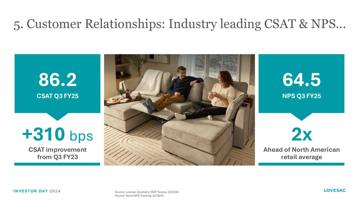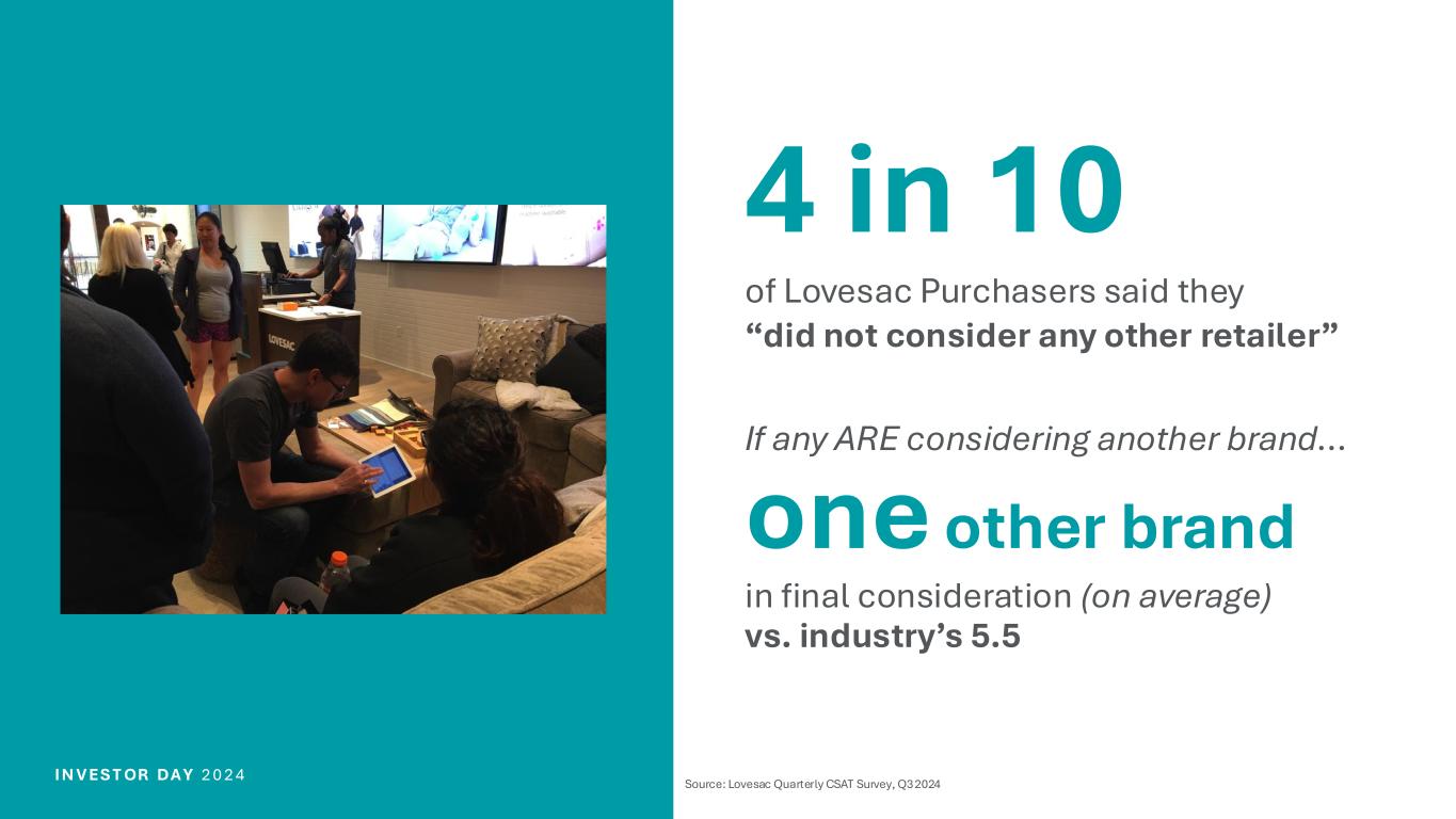 I N V ES T OR DA Y 2 0 2 4 4 in 10 of Lovesac Purchasers said they “did not consider any other retailer” If any ARE considering another brand… one other brand in final consideration (on average) vs. industry’s 5.5 Source: Lovesac Quarterly CSAT Survey, Q3 2024