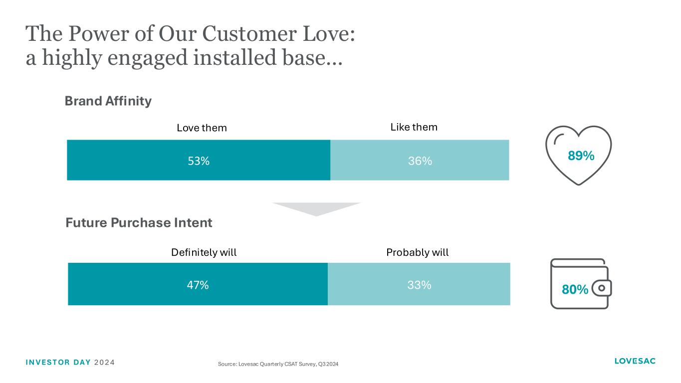I N V ES T OR DA Y 2 0 2 4 The Power of Our Customer Love: a highly engaged installed base… 47% 33% Future Purchase Intent Definitely will Probably will 80% 53% 36% Brand Affinity Love them Like them 89% Source: Lovesac Quarterly CSAT Survey, Q3 2024