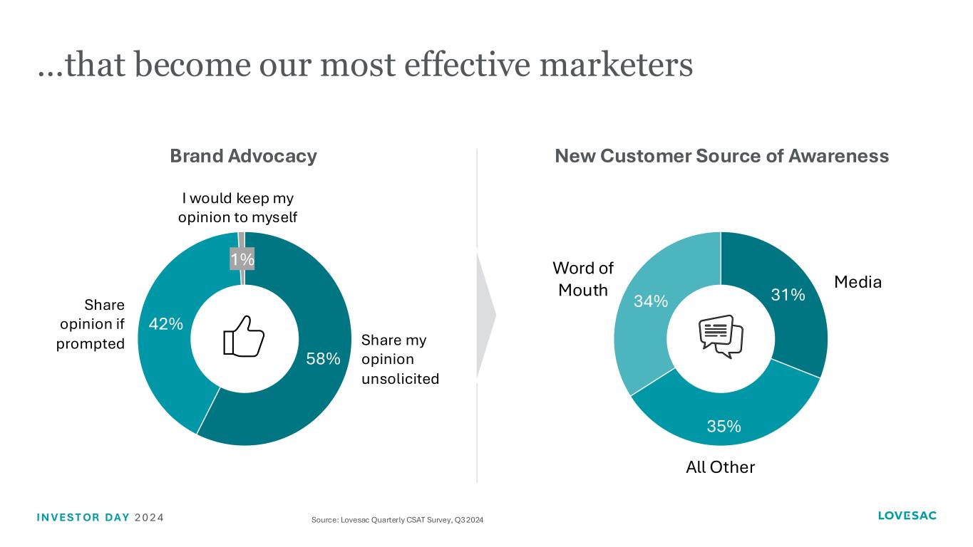 I N V ES T OR DA Y 2 0 2 4 …that become our most effective marketers 58% 42% 1% Share my opinion unsolicited Share opinion if prompted I would keep my opinion to myself New Customer Source of Awareness 31% 35% 34% Word of Mouth Media Brand Advocacy All Other Source: Lovesac Quarterly CSAT Survey, Q3 2024