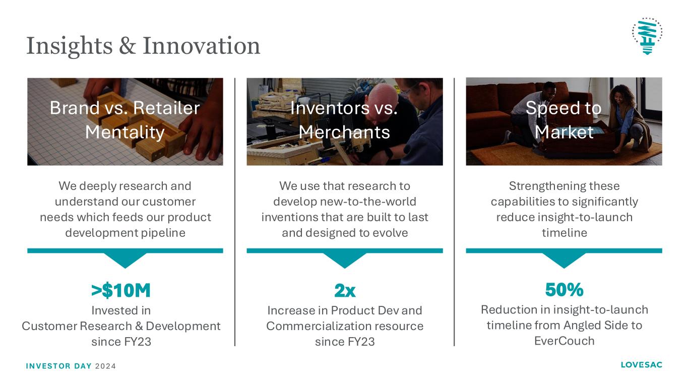 I N V ES T OR DA Y 2 0 2 4 Insights & Innovation We deeply research and understand our customer needs which feeds our product development pipeline We use that research to develop new-to-the-world inventions that are built to last and designed to evolve Strengthening these capabilities to significantly reduce insight-to-launch timeline >$10M Invested in Customer Research & Development since FY23 2x Increase in Product Dev and Commercialization resource since FY23 50% Reduction in insight-to-launch timeline from Angled Side to EverCouch Brand vs. Retailer Mentality Inventors vs. Merchants Speed to Market