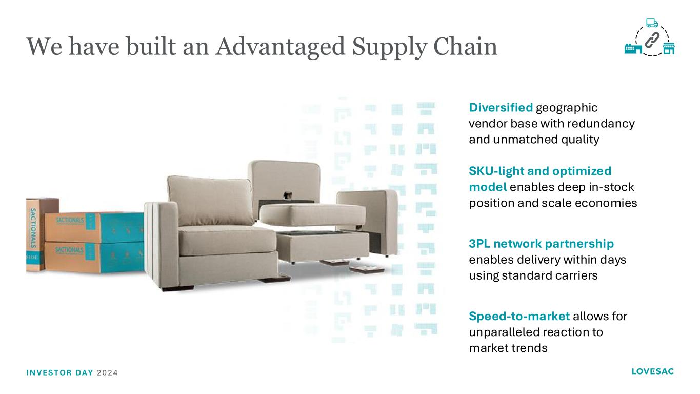 I N V ES T OR DA Y 2 0 2 4 We have built an Advantaged Supply Chain SKU-light and optimized model enables deep in-stock position and scale economies 3PL network partnership enables delivery within days using standard carriers Speed-to-market allows for unparalleled reaction to market trends Diversified geographic vendor base with redundancy and unmatched quality