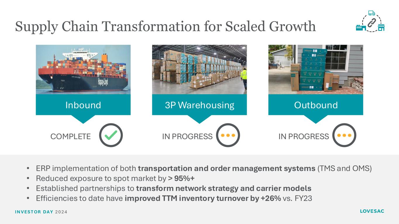 I N V ES T OR DA Y 2 0 2 4 Supply Chain Transformation for Scaled Growth • ERP implementation of both transportation and order management systems (TMS and OMS) • Reduced exposure to spot market by > 95%+ • Established partnerships to transform network strategy and carrier models • Efficiencies to date have improved TTM inventory turnover by +26% vs. FY23 Inbound 3P Warehousing Outbound IN PROGRESSIN PROGRESSCOMPLETE