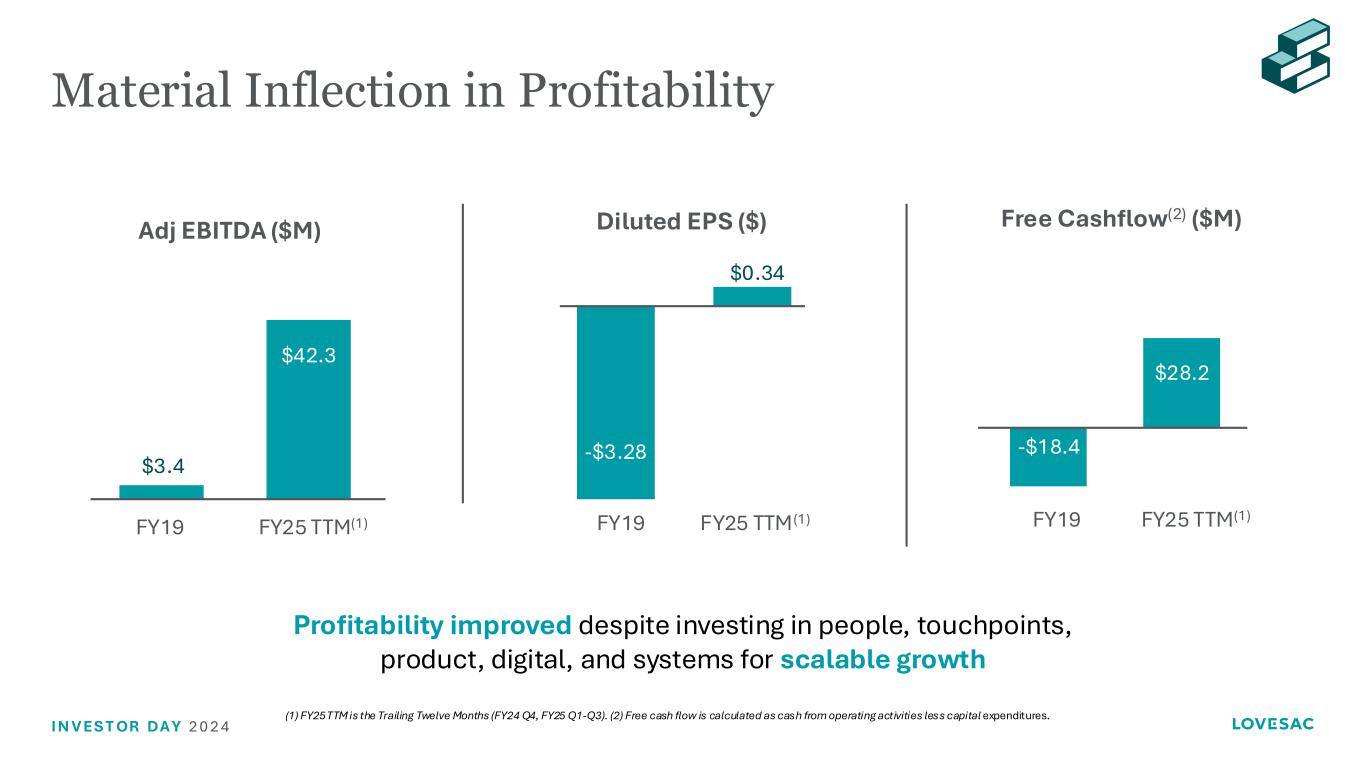 I N V ES T OR DA Y 2 0 2 4 $3.4 $42.3 FY19 FY25 TTM(1) Material Inflection in Profitability Diluted EPS ($) -$3.28 $0.34 Profitability improved despite investing in people, touchpoints, product, digital, and systems for scalable growth FY19 FY25 TTM(1)9 Adj EBITDA ($M) -$18.4 $28.2 Free Cashflow(2) ($M) (1) FY25 TTM is the Trailing Twelve Months (FY24 Q4, FY25 Q1-Q3). (2) Free cash flow is calculated as cash from operating activities less capital expenditures. FY25 TM(1)9 FY19 FY25 TTM(1)9