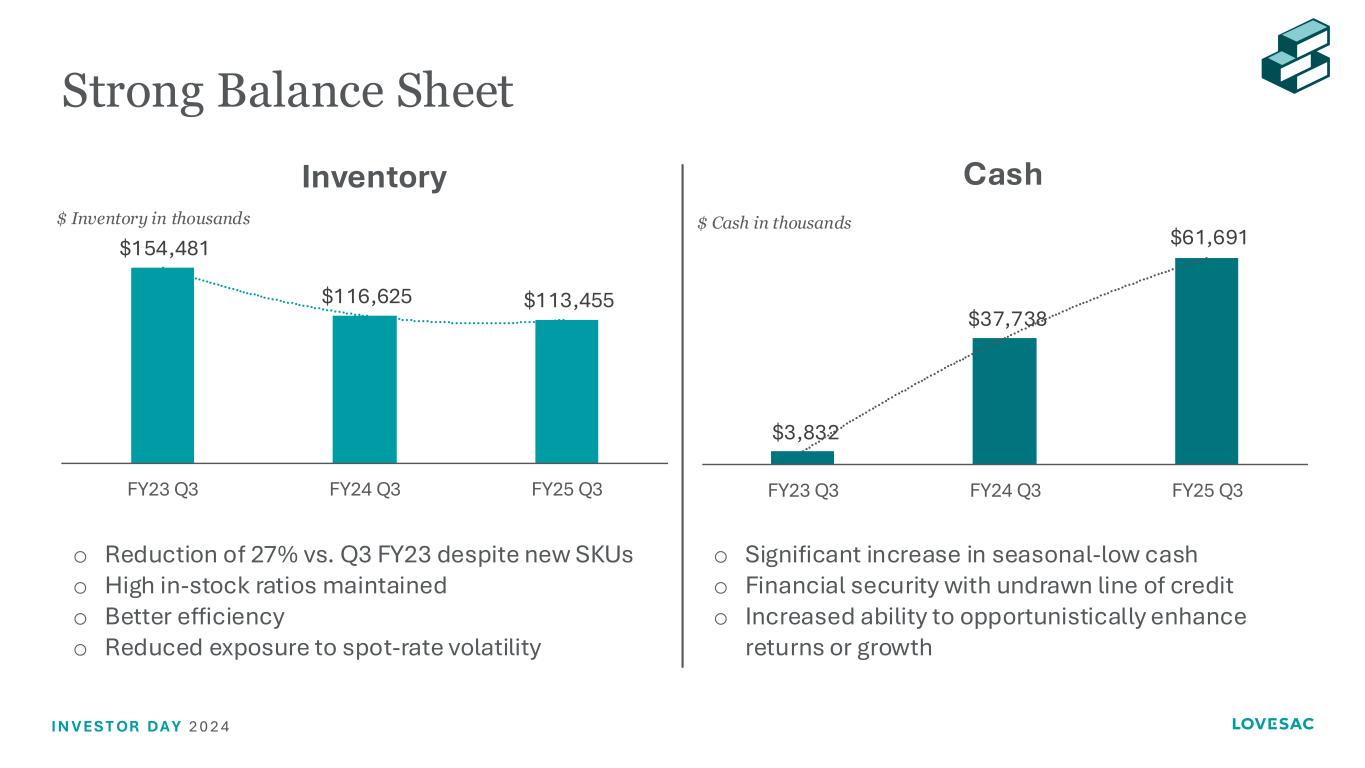 I N V ES T OR DA Y 2 0 2 4 Strong Balance Sheet $154,481 $116,625 $113,455 FY23 Q3 FY24 Q3 FY25 Q3 $ Inventory in thousands o Reduction of 27% vs. Q3 FY23 despite new SKUs o High in-stock ratios maintained o Better efficiency o Reduced exposure to spot-rate volatility Inventory $3,832 $37,738 $61,691 FY23 Q3 FY24 Q3 FY25 Q3 $ Cash in thousands o Significant increase in seasonal-low cash o Financial security with undrawn line of credit o Increased ability to opportunistically enhance returns or growth Cash