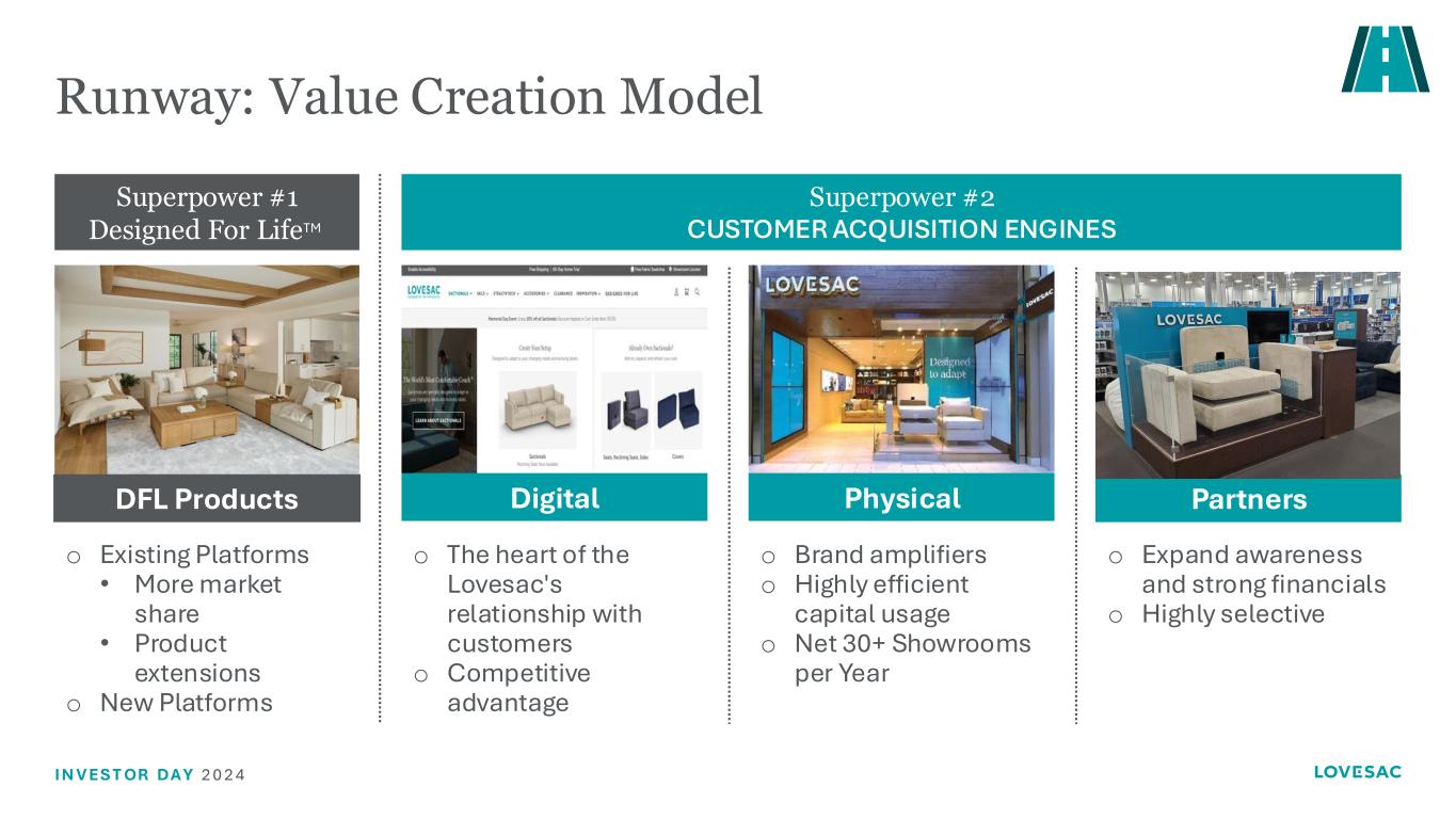I N V ES T OR DA Y 2 0 2 4 Runway: Value Creation Model Physical o Brand amplifiers o Highly efficient capital usage o Net 30+ Showrooms per Year DFL Products o Existing Platforms • More market share • Product extensions o New Platforms Superpower #1 Designed For Life TM Digital o The heart of the Lovesac's relationship with customers o Competitive advantage Superpower #2 CUSTOMER ACQUISITION ENGINES Partners o Expand awareness and strong financials o Highly selective