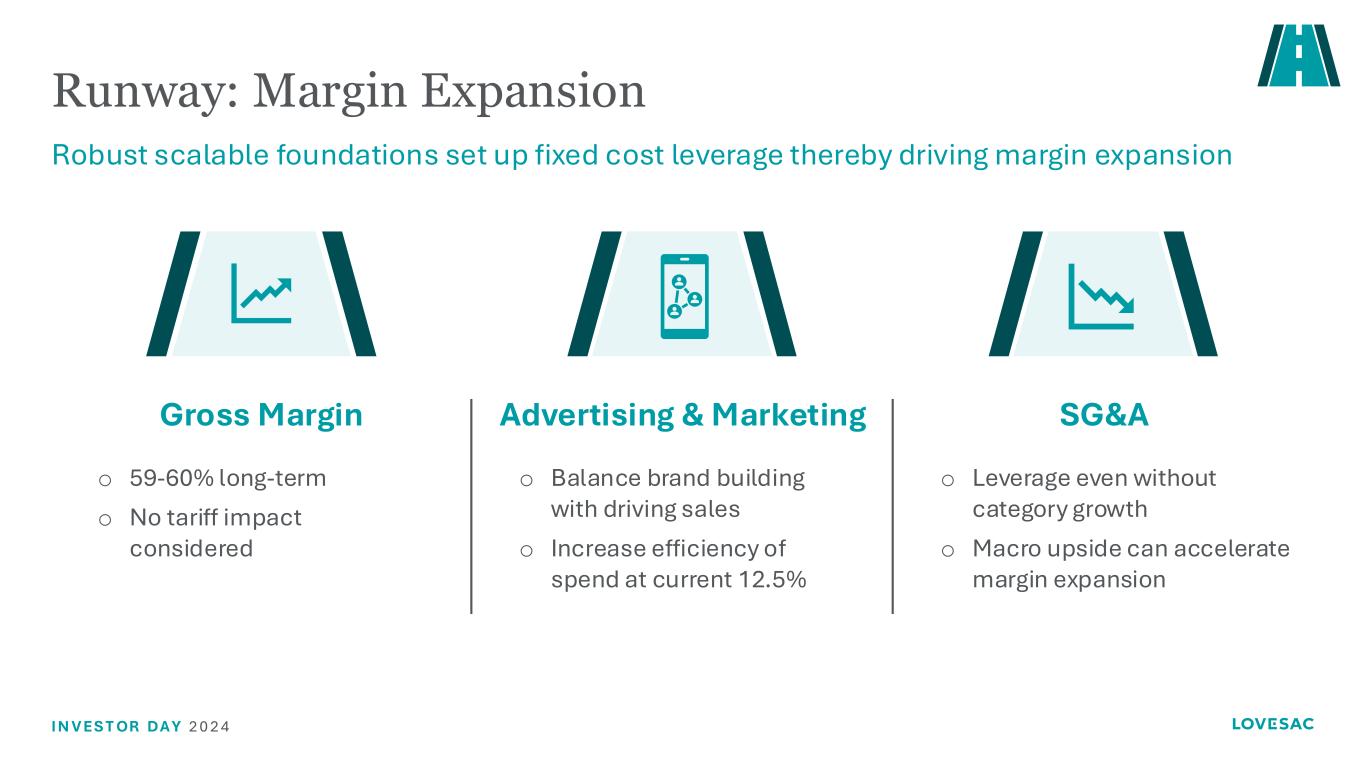 I N V ES T OR DA Y 2 0 2 4 Runway: Margin Expansion Robust scalable foundations set up fixed cost leverage thereby driving margin expansion SG&A o Leverage even without category growth o Macro upside can accelerate margin expansion Gross Margin o 59-60% long-term o No tariff impact considered Advertising & Marketing o Balance brand building with driving sales o Increase efficiency of spend at current 12.5%