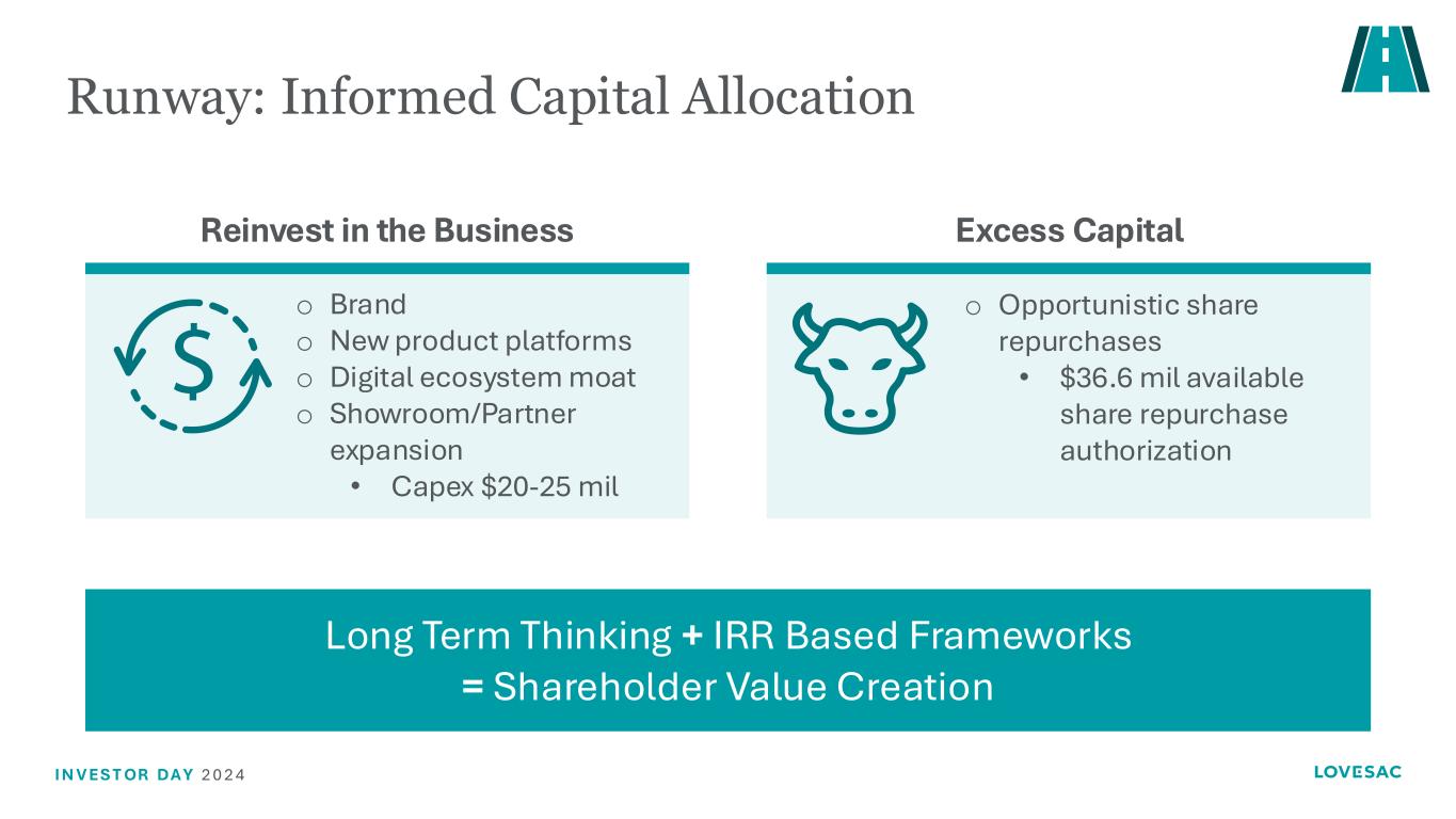 I N V ES T OR DA Y 2 0 2 4 Reinvest in the Business Excess Capital Runway: Informed Capital Allocation o Brand o New product platforms o Digital ecosystem moat o Showroom/Partner expansion • Capex $20-25 mil o Opportunistic share repurchases • $36.6 mil available share repurchase authorization Long Term Thinking + IRR Based Frameworks = Shareholder Value Creation