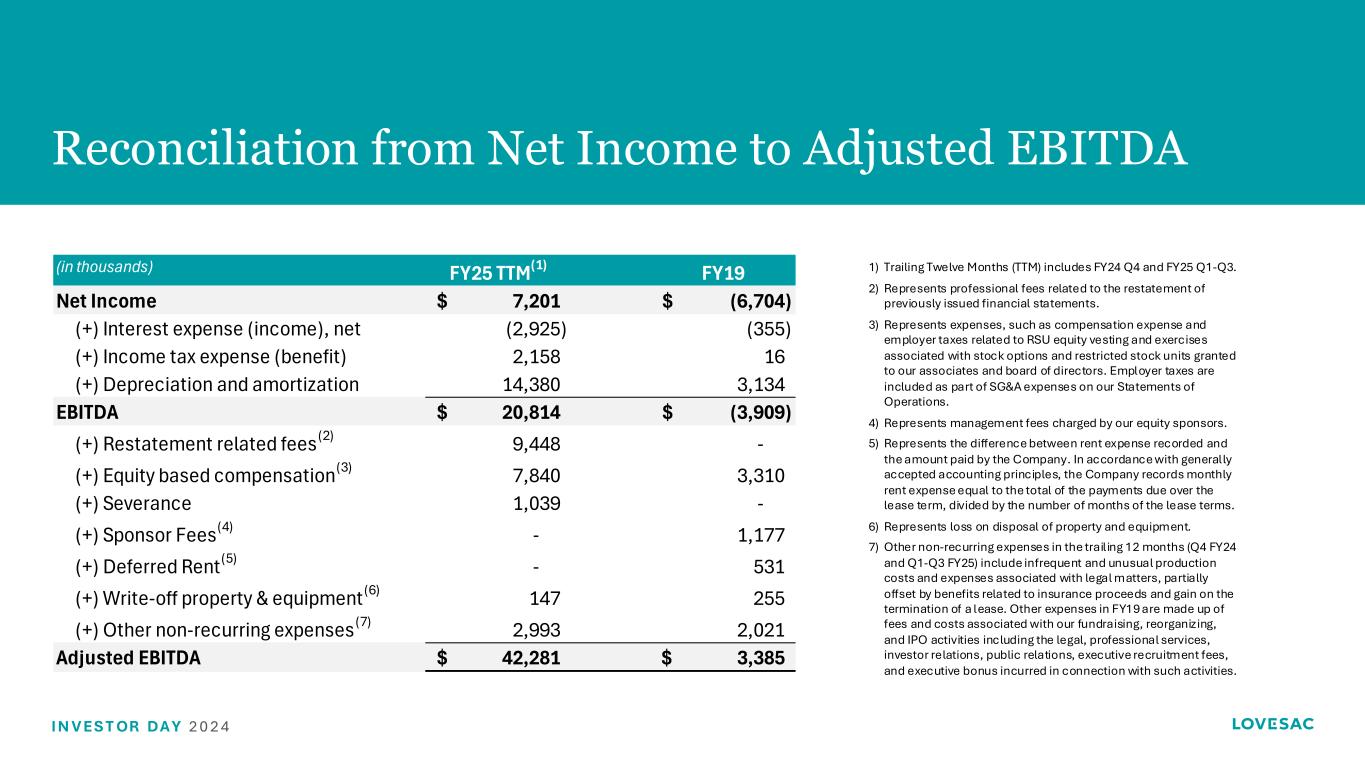 I N V ES T OR DA Y 2 0 2 4 1) Trailing Twelve Months (TTM) includes FY24 Q4 and FY25 Q1-Q3. 2) Represents professional fees related to the restatement of previously issued financial statements. 3) Represents expenses, such as compensation expense and employer taxes related to RSU equity vesting and exercises associated with stock options and restricted stock units granted to our associates and board of directors. Employer taxes are included as part of SG&A expenses on our Statements of Operations. 4) Represents management fees charged by our equity sponsors. 5) Represents the difference between rent expense recorded and the amount paid by the Company. In accordance with generally accepted accounting principles, the Company records monthly rent expense equal to the total of the payments due over the lease term, divided by the number of months of the lease terms. 6) Represents loss on disposal of property and equipment. 7) Other non-recurring expenses in the trailing 12 months (Q4 FY24 and Q1-Q3 FY25) include infrequent and unusual production costs and expenses associated with legal matters, partially offset by benefits related to insurance proceeds and gain on the termination of a lease. Other expenses in FY19 are made up of fees and costs associated with our fundraising, reorganizing, and IPO activities including the legal, professional services, investor relations, public relations, executive recruitment fees, and executive bonus incurred in connection with such activities. (in thousands) FY25 TTM(1) FY19 Net Income 7,201$ (6,704)$ (+) Interest expense (income), net (2,925) (355) (+) Income tax expense (benefit) 2,158 16 (+) Depreciation and amortization 14,380 3,134 EBITDA 20,814$ (3,909)$ (+) Restatement related fees(2) 9,448 - (+) Equity based compensation(3) 7,840 3,310 (+) Severance 1,039 - (+) Sponsor Fees(4) - 1,177 (+) Deferred Rent(5) - 531 (+) Write-off property & equipment(6) 147 255 (+) Other non-recurring expenses(7) 2,993 2,021 Adjusted EBITDA 42,281$ 3,385$ Reconciliation from Net Income to Adjusted EBITDA