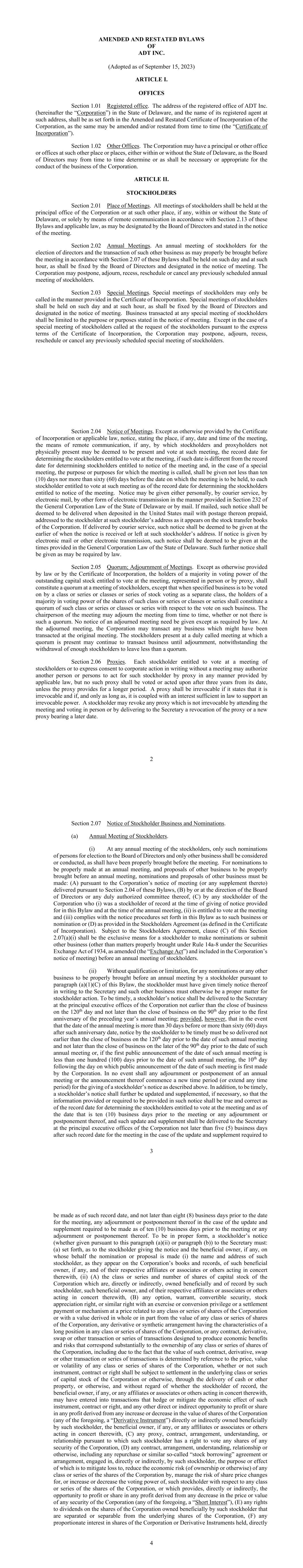 AMENDED AND RESTATED BYLAWS OF ADT INC. (Adopted as of September 15, 2023) ARTICLE I. OFFICES Section 1.01 Registered office. The address of the registered office of ADT Inc. (hereinafter the “Corporation”) in the State of Delaware, and the name of its registered agent at such address, shall be as set forth in the Amended and Restated Certificate of Incorporation of the Corporation, as the same may be amended and/or restated from time to time (the “Certificate of Incorporation”). Section 1.02 Other Offices. The Corporation may have a principal or other office or offices at such other place or places, either within or without the State of Delaware, as the Board of Directors may from time to time determine or as shall be necessary or appropriate for the conduct of the business of the Corporation. ARTICLE II. STOCKHOLDERS Section 2.01 Place of Meetings. All meetings of stockholders shall be held at the principal office of the Corporation or at such other place, if any, within or without the State of Delaware, or solely by means of remote communication in accordance with Section 2.13 of these Bylaws and applicable law, as may be designated by the Board of Directors and stated in the notice of the meeting. Section 2.02 Annual Meetings. An annual meeting of stockholders for the election of directors and the transaction of such other business as may properly be brought before the meeting in accordance with Section 2.07 of these Bylaws shall be held on such day and at such hour, as shall be fixed by the Board of Directors and designated in the notice of meeting. The Corporation may postpone, adjourn, recess, reschedule or cancel any previously scheduled annual meeting of stockholders. Section 2.03 Special Meetings. Special meetings of stockholders may only be called in the manner provided in the Certificate of Incorporation. Special meetings of stockholders shall be held on such day and at such hour, as shall be fixed by the Board of Directors and designated in the notice of meeting. Business transacted at any special meeting of stockholders shall be limited to the purpose or purposes stated in the notice of meeting. Except in the case of a special meeting of stockholders called at the request of the stockholders pursuant to the express terms of the Certificate of Incorporation, the Corporation may postpone, adjourn, recess, reschedule or cancel any previously scheduled special meeting of stockholders. 2 Section 2.04 Notice of Meetings. Except as otherwise provided by the Certificate of Incorporation or applicable law, notice, stating the place, if any, date and time of the meeting, the means of remote communication, if any, by which stockholders and proxyholders not physically present may be deemed to be present and vote at such meeting, the record date for determining the stockholders entitled to vote at the meeting, if such date is different from the record date for determining stockholders entitled to notice of the meeting and, in the case of a special meeting, the purpose or purposes for which the meeting is called, shall be given not less than ten (10) days nor more than sixty (60) days before the date on which the meeting is to be held, to each stockholder entitled to vote at such meeting as of the record date for determining the stockholders entitled to notice of the meeting. Notice may be given either personally, by courier service, by electronic mail, by other form of electronic transmission in the manner provided in Section 232 of the General Corporation Law of the State of Delaware or by mail. If mailed, such notice shall be deemed to be delivered when deposited in the United States mail with postage thereon prepaid, addressed to the stockholder at such stockholder’s address as it appears on the stock transfer books of the Corporation. If delivered by courier service, such notice shall be deemed to be given at the earlier of when the notice is received or left at such stockholder’s address. If notice is given by electronic mail or other electronic transmission, such notice shall be deemed to be given at the times provided in the General Corporation Law of the State of Delaware. Such further notice shall be given as may be required by law. Section 2.05 Quorum; Adjournment of Meetings. Except as otherwise provided by law or by the Certificate of Incorporation, the holders of a majority in voting power of the outstanding capital stock entitled to vote at the meeting, represented in person or by proxy, shall constitute a quorum at a meeting of stockholders, except that when specified business is to be voted on by a class or series or classes or series of stock voting as a separate class, the holders of a majority in voting power of the shares of such class or series or classes or series shall constitute a quorum of such class or series or classes or series with respect to the vote on such business. The chairperson of the meeting may adjourn the meeting from time to time, whether or not there is such a quorum. No notice of an adjourned meeting need be given except as required by law. At the adjourned meeting, the Corporation may transact any business which might have been transacted at the original meeting. The stockholders present at a duly called meeting at which a quorum is present may continue to transact business until adjournment, notwithstanding the withdrawal of enough stockholders to leave less than a quorum. Section 2.06 Proxies. Each stockholder entitled to vote at a meeting of stockholders or to express consent to corporate action in writing without a meeting may authorize another person or persons to act for such stockholder by proxy in any manner provided by applicable law, but no such proxy shall be voted or acted upon after three years from its date, unless the proxy provides for a longer period. A proxy shall be irrevocable if it states that it is irrevocable and if, and only as long as, it is coupled with an interest sufficient in law to support an irrevocabl