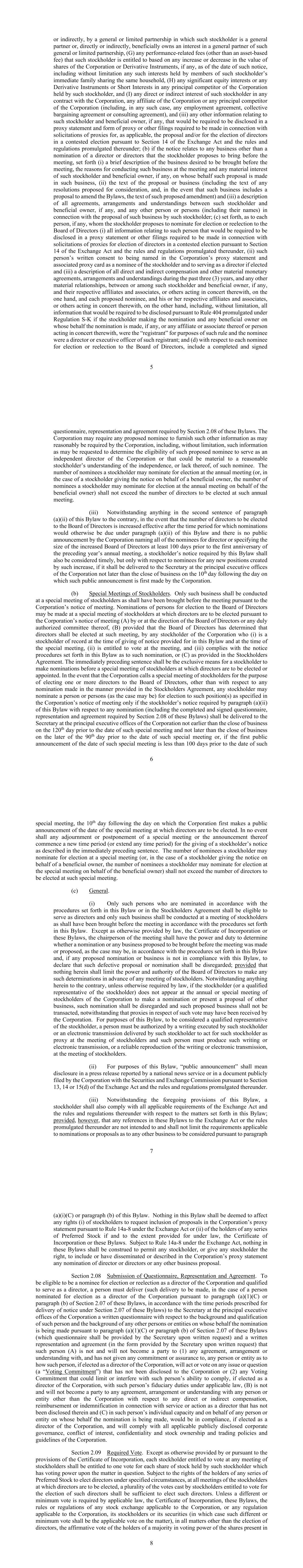5 or indirectly, by a general or limited partnership in which such stockholder is a general partner or, directly or indirectly, beneficially owns an interest in a general partner of such general or limited partnership, (G) any performance-related fees (other than an asset-based fee) that such stockholder is entitled to based on any increase or decrease in the value of shares of the Corporation or Derivative Instruments, if any, as of the date of such notice, including without limitation any such interests held by members of such stockholder’s immediate family sharing the same household, (H) any significant equity interests or any Derivative Instruments or Short Interests in any principal competitor of the Corporation held by such stockholder, and (I) any direct or indirect interest of such stockholder in any contract with the Corporation, any affiliate of the Corporation or any principal competitor of the Corporation (including, in any such case, any employment agreement, collective bargaining agreement or consulting agreement), and (iii) any other information relating to such stockholder and beneficial owner, if any, that would be required to be disclosed in a proxy statement and form of proxy or other filings required to be made in connection with solicitations of proxies for, as applicable, the proposal and/or for the election of directors in a contested election pursuant to Section 14 of the Exchange Act and the rules and regulations promulgated thereunder; (b) if the notice relates to any business other than a nomination of a director or directors that the stockholder proposes to bring before the meeting, set forth (i) a brief description of the business desired to be brought before the meeting, the reasons for conducting such business at the meeting and any material interest of such stockholder and beneficial owner, if any, on whose behalf such proposal is made in such business, (ii) the text of the proposal or business (including the text of any resolutions proposed for consideration, and, in the event that such business includes a proposal to amend the Bylaws, the text of such proposed amendment) and (iii) a description of all agreements, arrangements and understandings between such stockholder and beneficial owner, if any, and any other person or persons (including their names) in connection with the proposal of such business by such stockholder; (c) set forth, as to each person, if any, whom the stockholder proposes to nominate for election or reelection to the Board of Directors (i) all information relating to such person that would be required to be disclosed in a proxy statement or other filings required to be made in connection with solicitations of proxies for election of directors in a contested election pursuant to Section 14 of the Exchange Act and the rules and regulations promulgated thereunder, (ii) such person’s written consent to being named in the Corporation’s proxy statement and associated proxy card as a nominee of the stockholder and to serving as a director if elected and (iii) a description of all direct and indirect compensation and other material monetary agreements, arrangements and understandings during the past three (3) years, and any other material relationships, between or among such stockholder and beneficial owner, if any, and their respective affiliates and associates, or others acting in concert therewith, on the one hand, and each proposed nominee, and his or her respective affiliates and associates, or others acting in concert therewith, on the other hand, including, without limitation, all information that would be required to be disclosed pursuant to Rule 404 promulgated under Regulation S-K if the stockholder making the nomination and any beneficial owner on whose behalf the nomination is made, if any, or any affiliate or associate thereof or person acting in concert therewith, were the “registrant” for purposes of such rule and the nominee were a director or executive officer of such registrant; and (d) with respect to each nominee for election or reelection to the Board of Directors, include a completed and signed 6 questionnaire, representation and agreement required by Section 2.08 of these Bylaws. The Corporation may require any proposed nominee to furnish such other information as may reasonably be required by the Corporation, including, without limitation, such information as may be requested to determine the eligibility of such proposed nominee to serve as an independent director of the Corporation or that could be material to a reasonable stockholder’s understanding of the independence, or lack thereof, of such nominee. The number of nominees a stockholder may nominate for election at the annual meeting (or, in the case of a stockholder giving the notice on behalf of a beneficial owner, the number of nominees a stockholder may nominate for election at the annual meeting on behalf of the beneficial owner) shall not exceed the number of directors to be elected at such annual meeting. (iii) Notwithstanding anything in the second sentence of paragraph (a)(ii) of this Bylaw to the contrary, in the event that the number of directors to be elected to the Board of Directors is increased effective after the time period for which nominations would otherwise be due under paragraph (a)(ii) of this Bylaw and there is no public announcement by the Corporation naming all of the nominees for director or specifying the size of the increased Board of Directors at least 100 days prior to the first anniversary of the preceding year’s annual meeting, a stockholder’s notice required by this Bylaw shall also be considered timely, but only with respect to nominees for any new positions created by such increase, if it shall be delivered to the Secretary at the principal executive offices of the Corporation not later than the close of business on the 10th day following the day on which such public announcement is first made by the Corporation