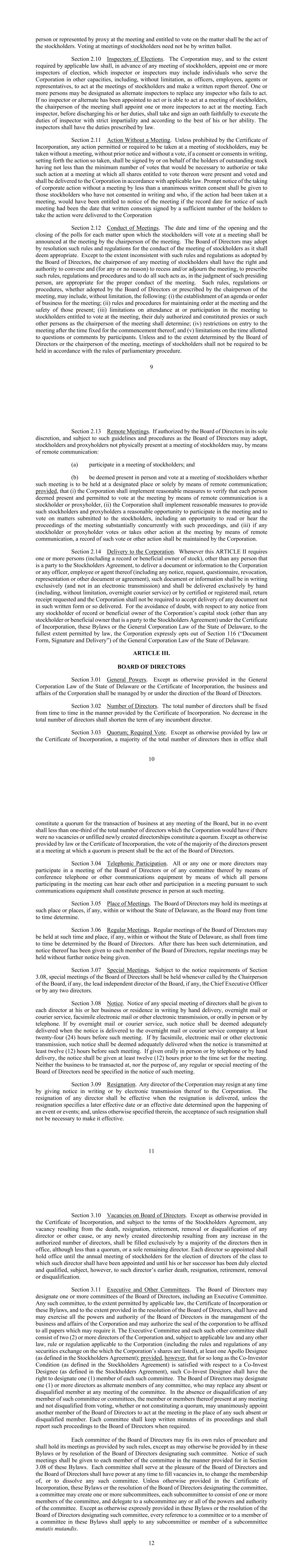9 person or represented by proxy at the meeting and entitled to vote on the matter shall be the act of the stockholders. Voting at meetings of stockholders need not be by written ballot. Section 2.10 Inspectors of Elections. The Corporation may, and to the extent required by applicable law shall, in advance of any meeting of stockholders, appoint one or more inspectors of election, which inspector or inspectors may include individuals who serve the Corporation in other capacities, including, without limitation, as officers, employees, agents or representatives, to act at the meetings of stockholders and make a written report thereof. One or more persons may be designated as alternate inspectors to replace any inspector who fails to act. If no inspector or alternate has been appointed to act or is able to act at a meeting of stockholders, the chairperson of the meeting shall appoint one or more inspectors to act at the meeting. Each inspector, before discharging his or her duties, shall take and sign an oath faithfully to execute the duties of inspector with strict impartiality and according to the best of his or her ability. The inspectors shall have the duties prescribed by law. Section 2.11 Action Without a Meeting. Unless prohibited by the Certificate of Incorporation, any action permitted or required to be taken at a meeting of stockholders, may be taken without a meeting, without prior notice and without a vote, if a consent or consents in writing, setting forth the action so taken, shall be signed by or on behalf of the holders of outstanding stock having not less than the minimum number of votes that would be necessary to authorize or take such action at a meeting at which all shares entitled to vote thereon were present and voted and shall be delivered to the Corporation in accordance with applicable law. Prompt notice of the taking of corporate action without a meeting by less than a unanimous written consent shall be given to those stockholders who have not consented in writing and who, if the action had been taken at a meeting, would have been entitled to notice of the meeting if the record date for notice of such meeting had been the date that written consents signed by a sufficient number of the holders to take the action were delivered to the Corporation Section 2.12 Conduct of Meetings. The date and time of the opening and the closing of the polls for each matter upon which the stockholders will vote at a meeting shall be announced at the meeting by the chairperson of the meeting. The Board of Directors may adopt by resolution such rules and regulations for the conduct of the meeting of stockholders as it shall deem appropriate. Except to the extent inconsistent with such rules and regulations as adopted by the Board of Directors, the chairperson of any meeting of stockholders shall have the right and authority to convene and (for any or no reason) to recess and/or adjourn the meeting, to prescribe such rules, regulations and procedures and to do all such acts as, in the judgment of such presiding person, are appropriate for the proper conduct of the meeting. Such rules, regulations or procedures, whether adopted by the Board of Directors or prescribed by the chairperson of the meeting, may include, without limitation, the following: (i) the establishment of an agenda or order of business for the meeting; (ii) rules and procedures for maintaining order at the meeting and the safety of those present; (iii) limitations on attendance at or participation in the meeting to stockholders entitled to vote at the meeting, their duly authorized and constituted proxies or such other persons as the chairperson of the meeting shall determine; (iv) restrictions on entry to the meeting after the time fixed for the commencement thereof; and (v) limitations on the time allotted to questions or comments by participants. Unless and to the extent determined by the Board of Directors or the chairperson of the meeting, meetings of stockholders shall not be required to be held in accordance with the rules of parliamentary procedure. 10 Section 2.13 Remote Meetings. If authorized by the Board of Directors in its sole discretion, and subject to such guidelines and procedures as the Board of Directors may adopt, stockholders and proxyholders not physically present at a meeting of stockholders may, by means of remote communication: (a) participate in a meeting of stockholders; and (b) be deemed present in person and vote at a meeting of stockholders whether such meeting is to be held at a designated place or solely by means of remote communication; provided, that (i) the Corporation shall implement reasonable measures to verify that each person deemed present and permitted to vote at the meeting by means of remote communication is a stockholder or proxyholder, (ii) the Corporation shall implement reasonable measures to provide such stockholders and proxyholders a reasonable opportunity to participate in the meeting and to vote on matters submitted to the stockholders, including an opportunity to read or hear the proceedings of the meeting substantially concurrently with such proceedings, and (iii) if any stockholder or proxyholder votes or takes other action at the meeting by means of remote communication, a record of such vote or other action shall be maintained by the Corporation. Section 2.14 Delivery to the Corporation. Whenever this ARTICLE II requires one or more persons (including a record or beneficial owner of stock), other than any person that is a party to the Stockholders Agreement, to deliver a document or information to the Corporation or any officer, employee or agent thereof (including any notice, request, questionnaire, revocation, representation or other document or agreement), such document or information shall be in writing exclusively (and not in an electronic transmission) and shall be delivered exclusively by hand (including, without limitation, overnight courier service) or b