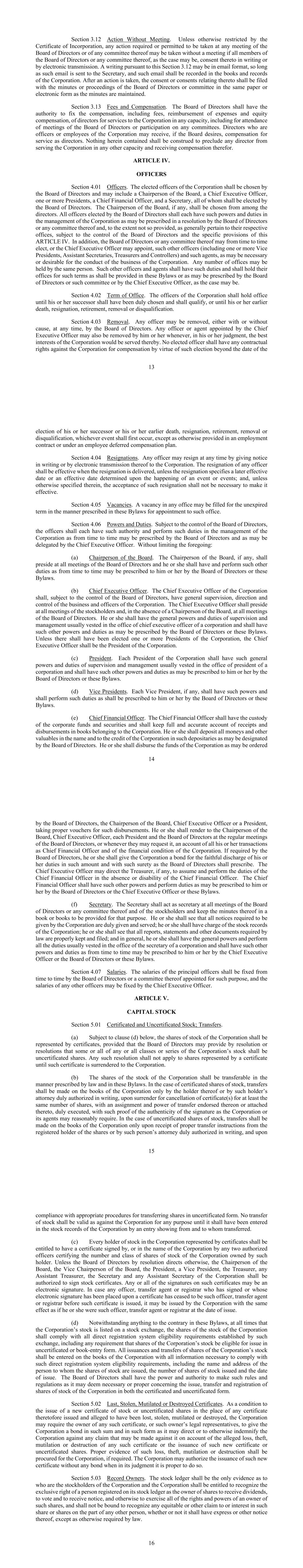 13 Section 3.12 Action Without Meeting. Unless otherwise restricted by the Certificate of Incorporation, any action required or permitted to be taken at any meeting of the Board of Directors or of any committee thereof may be taken without a meeting if all members of the Board of Directors or any committee thereof, as the case may be, consent thereto in writing or by electronic transmission. A writing pursuant to this Section 3.12 may be in email format, so long as such email is sent to the Secretary, and such email shall be recorded in the books and records of the Corporation. After an action is taken, the consent or consents relating thereto shall be filed with the minutes or proceedings of the Board of Directors or committee in the same paper or electronic form as the minutes are maintained. Section 3.13 Fees and Compensation. The Board of Directors shall have the authority to fix the compensation, including fees, reimbursement of expenses and equity compensation, of directors for services to the Corporation in any capacity, including for attendance of meetings of the Board of Directors or participation on any committees. Directors who are officers or employees of the Corporation may receive, if the Board desires, compensation for service as directors. Nothing herein contained shall be construed to preclude any director from serving the Corporation in any other capacity and receiving compensation therefor. ARTICLE IV. OFFICERS Section 4.01 Officers. The elected officers of the Corporation shall be chosen by the Board of Directors and may include a Chairperson of the Board, a Chief Executive Officer, one or more Presidents, a Chief Financial Officer, and a Secretary, all of whom shall be elected by the Board of Directors. The Chairperson of the Board, if any, shall be chosen from among the directors. All officers elected by the Board of Directors shall each have such powers and duties in the management of the Corporation as may be prescribed in a resolution by the Board of Directors or any committee thereof and, to the extent not so provided, as generally pertain to their respective offices, subject to the control of the Board of Directors and the specific provisions of this ARTICLE IV. In addition, the Board of Directors or any committee thereof may from time to time elect, or the Chief Executive Officer may appoint, such other officers (including one or more Vice Presidents, Assistant Secretaries, Treasurers and Controllers) and such agents, as may be necessary or desirable for the conduct of the business of the Corporation. Any number of offices may be held by the same person. Such other officers and agents shall have such duties and shall hold their offices for such terms as shall be provided in these Bylaws or as may be prescribed by the Board of Directors or such committee or by the Chief Executive Officer, as the case may be. Section 4.02 Term of Office. The officers of the Corporation shall hold office until his or her successor shall have been duly chosen and shall qualify, or until his or her earlier death, resignation, retirement, removal or disqualification. Section 4.03 Removal. Any officer may be removed, either with or without cause, at any time, by the Board of Directors. Any officer or agent appointed by the Chief Executive Officer may also be removed by him or her whenever, in his or her judgment, the best interests of the Corporation would be served thereby. No elected officer shall have any contractual rights against the Corporation for compensation by virtue of such election beyond the date of the 14 election of his or her successor or his or her earlier death, resignation, retirement, removal or disqualification, whichever event shall first occur, except as otherwise provided in an employment contract or under an employee deferred compensation plan. Section 4.04 Resignations. Any officer may resign at any time by giving notice in writing or by electronic transmission thereof to the Corporation. The resignation of any officer shall be effective when the resignation is delivered, unless the resignation specifies a later effective date or an effective date determined upon the happening of an event or events; and, unless otherwise specified therein, the acceptance of such resignation shall not be necessary to make it effective. Section 4.05 Vacancies. A vacancy in any office may be filled for the unexpired term in the manner prescribed in these Bylaws for appointment to such office. Section 4.06 Powers and Duties. Subject to the control of the Board of Directors, the officers shall each have such authority and perform such duties in the management of the Corporation as from time to time may be prescribed by the Board of Directors and as may be delegated by the Chief Executive Officer. Without limiting the foregoing: (a) Chairperson of the Board. The Chairperson of the Board, if any, shall preside at all meetings of the Board of Directors and he or she shall have and perform such other duties as from time to time may be prescribed to him or her by the Board of Directors or these Bylaws. (b) Chief Executive Officer. The Chief Executive Officer of the Corporation shall, subject to the control of the Board of Directors, have general supervision, direction and control of the business and officers of the Corporation. The Chief Executive Officer shall preside at all meetings of the stockholders and, in the absence of a Chairperson of the Board, at all meetings of the Board of Directors. He or she shall have the general powers and duties of supervision and management usually vested in the office of chief executive officer of a corporation and shall have such other powers and duties as may be prescribed by the Board of Directors or these Bylaws. Unless there shall have been elected one or more Presidents of the Corporation, the Chief Executive Officer shall be the President of the Corporation. (c) President. Each President of the Corporation shall have such general powers and 