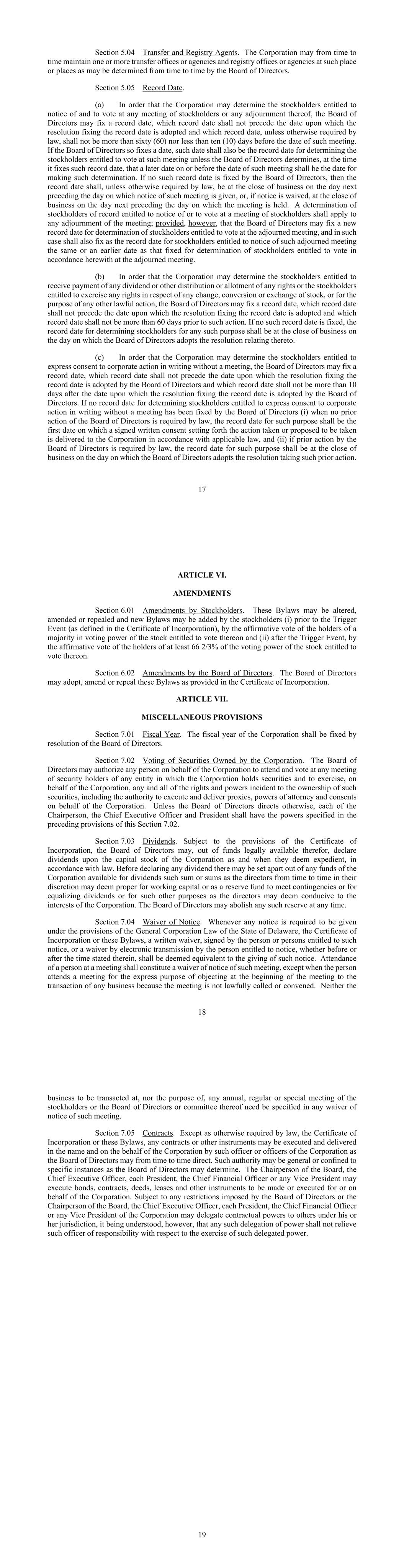 17 Section 5.04 Transfer and Registry Agents. The Corporation may from time to time maintain one or more transfer offices or agencies and registry offices or agencies at such place or places as may be determined from time to time by the Board of Directors. Section 5.05 Record Date. (a) In order that the Corporation may determine the stockholders entitled to notice of and to vote at any meeting of stockholders or any adjournment thereof, the Board of Directors may fix a record date, which record date shall not precede the date upon which the resolution fixing the record date is adopted and which record date, unless otherwise required by law, shall not be more than sixty (60) nor less than ten (10) days before the date of such meeting. If the Board of Directors so fixes a date, such date shall also be the record date for determining the stockholders entitled to vote at such meeting unless the Board of Directors determines, at the time it fixes such record date, that a later date on or before the date of such meeting shall be the date for making such determination. If no such record date is fixed by the Board of Directors, then the record date shall, unless otherwise required by law, be at the close of business on the day next preceding the day on which notice of such meeting is given, or, if notice is waived, at the close of business on the day next preceding the day on which the meeting is held. A determination of stockholders of record entitled to notice of or to vote at a meeting of stockholders shall apply to any adjournment of the meeting; provided, however, that the Board of Directors may fix a new record date for determination of stockholders entitled to vote at the adjourned meeting, and in such case shall also fix as the record date for stockholders entitled to notice of such adjourned meeting the same or an earlier date as that fixed for determination of stockholders entitled to vote in accordance herewith at the adjourned meeting. (b) In order that the Corporation may determine the stockholders entitled to receive payment of any dividend or other distribution or allotment of any rights or the stockholders entitled to exercise any rights in respect of any change, conversion or exchange of stock, or for the purpose of any other lawful action, the Board of Directors may fix a record date, which record date shall not precede the date upon which the resolution fixing the record date is adopted and which record date shall not be more than 60 days prior to such action. If no such record date is fixed, the record date for determining stockholders for any such purpose shall be at the close of business on the day on which the Board of Directors adopts the resolution relating thereto. (c) In order that the Corporation may determine the stockholders entitled to express consent to corporate action in writing without a meeting, the Board of Directors may fix a record date, which record date shall not precede the date upon which the resolution fixing the record date is adopted by the Board of Directors and which record date shall not be more than 10 days after the date upon which the resolution fixing the record date is adopted by the Board of Directors. If no record date for determining stockholders entitled to express consent to corporate action in writing without a meeting has been fixed by the Board of Directors (i) when no prior action of the Board of Directors is required by law, the record date for such purpose shall be the first date on which a signed written consent setting forth the action taken or proposed to be taken is delivered to the Corporation in accordance with applicable law, and (ii) if prior action by the Board of Directors is required by law, the record date for such purpose shall be at the close of business on the day on which the Board of Directors adopts the resolution taking such prior action. 18 ARTICLE VI. AMENDMENTS Section 6.01 Amendments by Stockholders. These Bylaws may be altered, amended or repealed and new Bylaws may be added by the stockholders (i) prior to the Trigger Event (as defined in the Certificate of Incorporation), by the affirmative vote of the holders of a majority in voting power of the stock entitled to vote thereon and (ii) after the Trigger Event, by the affirmative vote of the holders of at least 66 2/3% of the voting power of the stock entitled to vote thereon. Section 6.02 Amendments by the Board of Directors. The Board of Directors may adopt, amend or repeal these Bylaws as provided in the Certificate of Incorporation. ARTICLE VII. MISCELLANEOUS PROVISIONS Section 7.01 Fiscal Year. The fiscal year of the Corporation shall be fixed by resolution of the Board of Directors. Section 7.02 Voting of Securities Owned by the Corporation. The Board of Directors may authorize any person on behalf of the Corporation to attend and vote at any meeting of security holders of any entity in which the Corporation holds securities and to exercise, on behalf of the Corporation, any and all of the rights and powers incident to the ownership of such securities, including the authority to execute and deliver proxies, powers of attorney and consents on behalf of the Corporation. Unless the Board of Directors directs otherwise, each of the Chairperson, the Chief Executive Officer and President shall have the powers specified in the preceding provisions of this Section 7.02. Section 7.03 Dividends. Subject to the provisions of the Certificate of Incorporation, the Board of Directors may, out of funds legally available therefor, declare dividends upon the capital stock of the Corporation as and when they deem expedient, in accordance with law. Before declaring any dividend there may be set apart out of any funds of the Corporation available for dividends such sum or sums as the directors from time to time in their discretion may deem proper for working capital or as a reserve fund to meet contingencies or for equalizing dividends or for such other purposes as the d