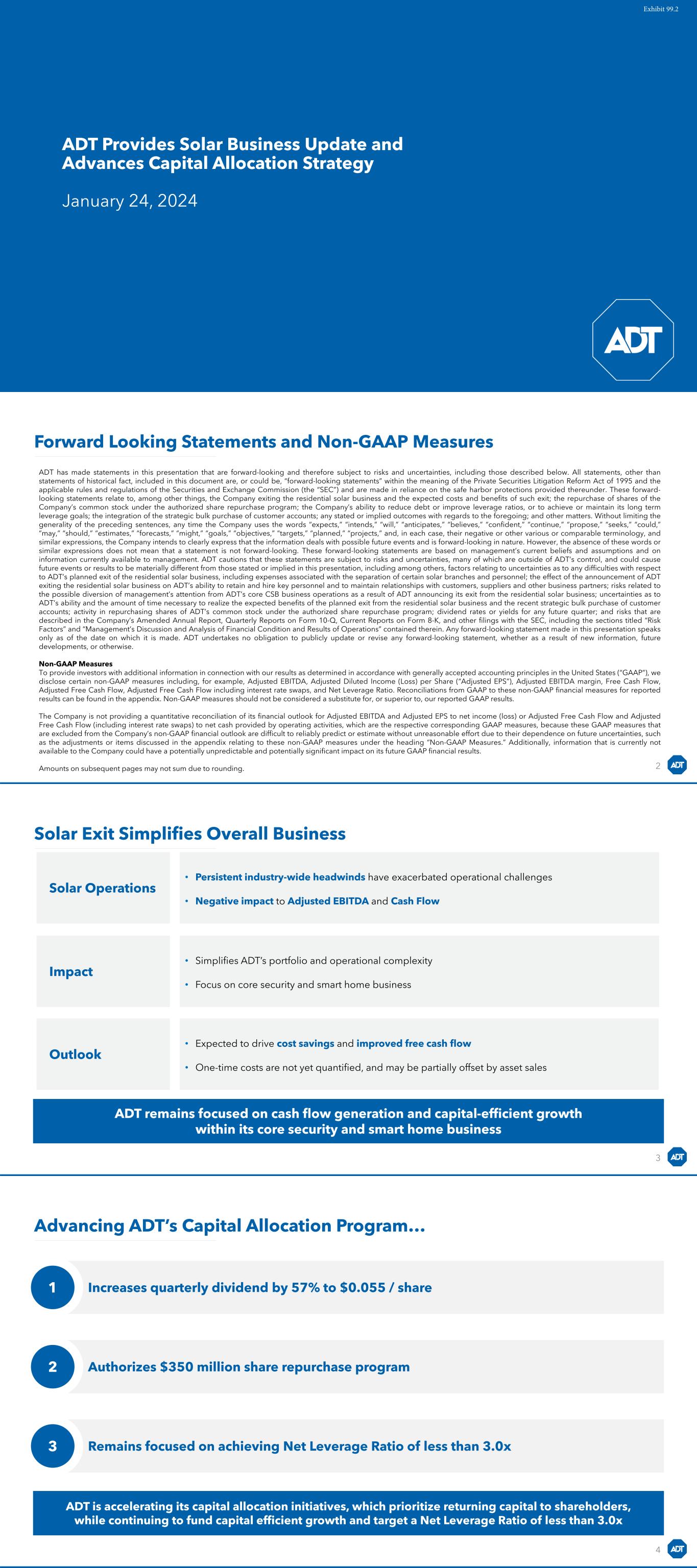 ADT Provides Solar Business Update and Advances Capital Allocation Strategy January 24, 2024 Exhibit 99.2 Forward Looking Statements and Non-GAAP Measures 2 ADT has made statements in this presentation that are forward-looking and therefore subject to risks and uncertainties, including those described below. All statements, other than statements of historical fact, included in this document are, or could be, “forward-looking statements” within the meaning of the Private Securities Litigation Reform Act of 1995 and the applicable rules and regulations of the Securities and Exchange Commission (the “SEC”) and are made in reliance on the safe harbor protections provided thereunder. These forward- looking statements relate to, among other things, the Company exiting the residential solar business and the expected costs and benefits of such exit; the repurchase of shares of the Company’s common stock under the authorized share repurchase program; the Company’s ability to reduce debt or improve leverage ratios, or to achieve or maintain its long term leverage goals; the integration of the strategic bulk purchase of customer accounts; any stated or implied outcomes with regards to the foregoing; and other matters. Without limiting the generality of the preceding sentences, any time the Company uses the words “expects,” “intends,” “will,” “anticipates,” “believes,” “confident,” “continue,” “propose,” “seeks,” “could,” “may,” “should,” “estimates,” “forecasts,” “might,” “goals,” “objectives,” “targets,” “planned,” “projects,” and, in each case, their negative or other various or comparable terminology, and similar expressions, the Company intends to clearly express that the information deals with possible future events and is forward-looking in nature. However, the absence of these words or similar expressions does not mean that a statement is not forward-looking. These forward-looking statements are based on management’s current beliefs and assumptions and on information currently available to management. ADT cautions that these statements are subject to risks and uncertainties, many of which are outside of ADT’s control, and could cause future events or results to be materially different from those stated or implied in this presentation, including among others, factors relating to uncertainties as to any difficulties with respect to ADT’s planned exit of the residential solar business, including expenses associated with the separation of certain solar branches and personnel; the effect of the announcement of ADT exiting the residential solar business on ADT’s ability to retain and hire key personnel and to maintain relationships with customers, suppliers and other business partners; risks related to the possible diversion of management’s attention from ADT’s core CSB business operations as a result of ADT announcing its exit from the residential solar business; uncertainties as to ADT’s ability and the amount of time necessary to realize the expected benefits of the planned exit from the residential solar business and the recent strategic bulk purchase of customer accounts; activity in repurchasing shares of ADT’s common stock under the authorized share repurchase program; dividend rates or yields for any future quarter; and risks that are described in the Company’s Amended Annual Report, Quarterly Reports on Form 10-Q, Current Reports on Form 8-K, and other filings with the SEC, including the sections titled “Risk Factors” and “Management’s Discussion and Analysis of Financial Condition and Results of Operations” contained therein. Any forward-looking statement made in this presentation speaks only as of the date on which it is made. ADT undertakes no obligation to publicly update or revise any forward-looking statement, whether as a result of new information, future developments, or otherwise. Non-GAAP Measures To provide investors with additional information in connection with our results as determined in accordance with generally accepted accounting principles in the United States (“GAAP”), we disclose certain non-GAAP measures including, for example, Adjusted EBITDA, Adjusted Diluted Income (Loss) per Share (“Adjusted EPS”), Adjusted EBITDA margin, Free Cash Flow, Adjusted Free Cash Flow, Adjusted Free Cash Flow including interest rate swaps, and Net Leverage Ratio. Reconciliations from GAAP to these non-GAAP financial measures for reported results can be found in the appendix. Non-GAAP measures should not be considered a substitute for, or superior to, our reported GAAP results. The Company is not providing a quantitative reconciliation of its financial outlook for Adjusted EBITDA and Adjusted EPS to net income (loss) or Adjusted Free Cash Flow and Adjusted Free Cash Flow (including interest rate swaps) to net cash provided by operating activities, which are the respective corresponding GAAP measures, because these GAAP measures that are excluded from the Company’s non-GAAP financial outlook are difficult to reliably predict or estimate without unreasonable effort due to their dependence on future uncertainties, such as the adjustments or items discussed in the appendix relating to these non-GAAP measures under the heading “Non-GAAP Measures.” Additionally, information that is currently not available to the Company could have a potentially unpredictable and potentially significant impact on its future GAAP financial results. Amounts on subsequent pages may not sum due to rounding. Solar Exit Simplifies Overall Business 3 Solar Operations • Persistent industry-wide headwinds have exacerbated operational challenges • Negative impact to Adjusted EBITDA and Cash Flow Outlook • Expected to drive cost savings and improved free cash flow • One-time costs are not yet quantified, and may be partially offset by asset sales ADT remains focused on cash flow gen