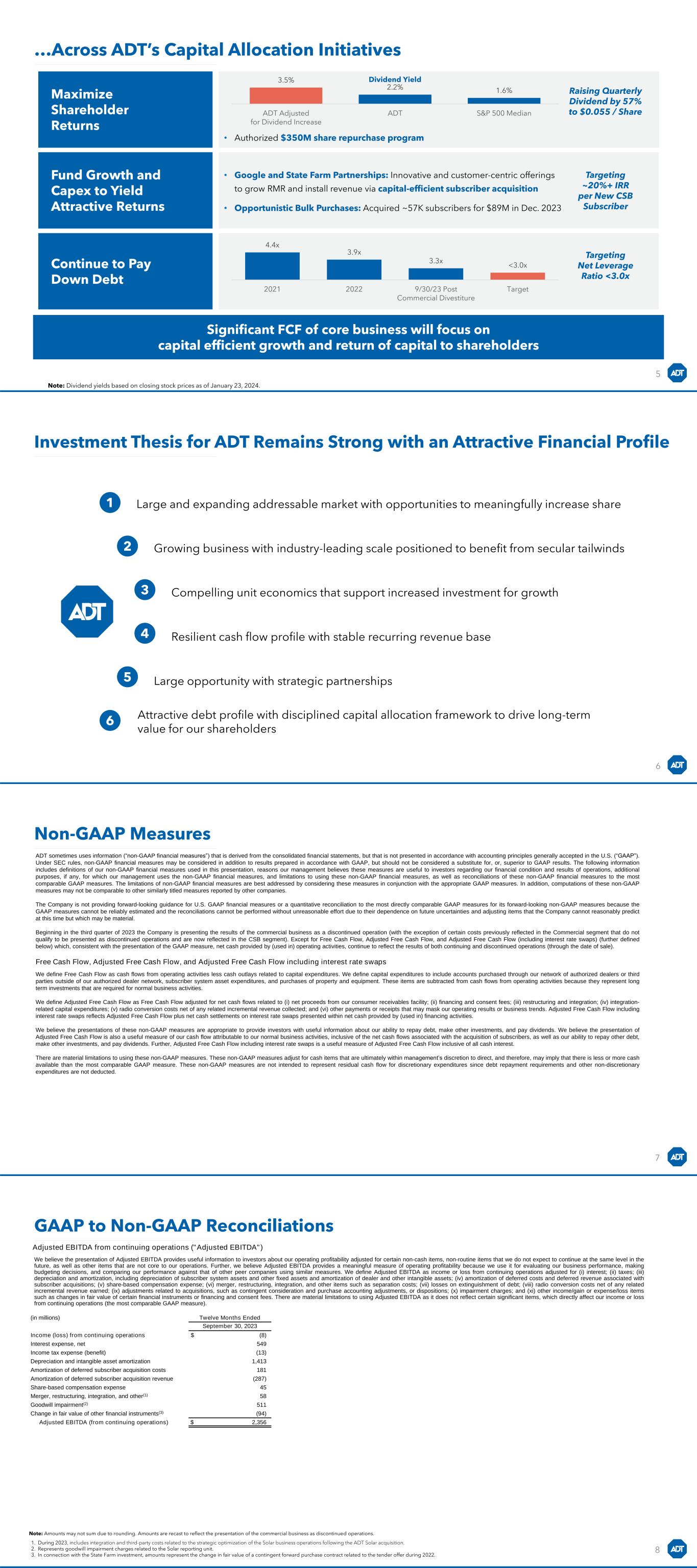 …Across ADT’s Capital Allocation Initiatives 5 Maximize Shareholder Returns • Authorized $350M share repurchase program Continue to Pay Down Debt • Google and State Farm Partnerships: Innovative and customer-centric offerings to grow RMR and install revenue via capital-efficient subscriber acquisition • Opportunistic Bulk Purchases: Acquired ~57K subscribers for $89M in Dec. 2023 Significant FCF of core business will focus on capital efficient growth and return of capital to shareholders Fund Growth and Capex to Yield Attractive Returns 4.4x 3.9x 3.3x <3.0x 2021 2022 9/30/23 Post Commercial Divestiture Target Targeting Net Leverage Ratio <3.0x Targeting ~20%+ IRR per New CSB Subscriber Raising Quarterly Dividend by 57% to $0.055 / Share 3.5% 2.2% 1.6% ADT Adjusted for Dividend Increase ADT S&P 500 Median Note: Dividend yields based on closing stock prices as of January 23, 2024. Dividend Yield Investment Thesis for ADT Remains Strong with an Attractive Financial Profile 6 Large and expanding addressable market with opportunities to meaningfully increase share Growing business with industry-leading scale positioned to benefit from secular tailwinds Compelling unit economics that support increased investment for growth Resilient cash flow profile with stable recurring revenue base Large opportunity with strategic partnerships Attractive debt profile with disciplined capital allocation framework to drive long-term value for our shareholders 1 2 3 4 5 6 7 Non-GAAP Measures ADT sometimes uses information (“non-GAAP financial measures”) that is derived from the consolidated financial statements, but that is not presented in accordance with accounting principles generally accepted in the U.S. (“GAAP”). Under SEC rules, non-GAAP financial measures may be considered in addition to results prepared in accordance with GAAP, but should not be considered a substitute for, or, superior to GAAP results. The following information includes definitions of our non-GAAP financial measures used in this presentation, reasons our management believes these measures are useful to investors regarding our financial condition and results of operations, additional purposes, if any, for which our management uses the non-GAAP financial measures, and limitations to using these non-GAAP financial measures, as well as reconciliations of these non-GAAP financial measures to the most comparable GAAP measures. The limitations of non-GAAP financial measures are best addressed by considering these measures in conjunction with the appropriate GAAP measures. In addition, computations of these non-GAAP measures may not be comparable to other similarly titled measures reported by other companies. The Company is not providing forward-looking guidance for U.S. GAAP financial measures or a quantitative reconciliation to the most directly comparable GAAP measures for its forward-looking non-GAAP measures because the GAAP measures cannot be reliably estimated and the reconciliations cannot be performed without unreasonable effort due to their dependence on future uncertainties and adjusting items that the Company cannot reasonably predict at this time but which may be material. Beginning in the third quarter of 2023 the Company is presenting the results of the commercial business as a discontinued operation (with the exception of certain costs previously reflected in the Commercial segment that do not qualify to be presented as discontinued operations and are now reflected in the CSB segment). Except for Free Cash Flow, Adjusted Free Cash Flow, and Adjusted Free Cash Flow (including interest rate swaps) (further defined below) which, consistent with the presentation of the GAAP measure, net cash provided by (used in) operating activities, continue to reflect the results of both continuing and discontinued operations (through the date of sale). We define Free Cash Flow as cash flows from operating activities less cash outlays related to capital expenditures. We define capital expenditures to include accounts purchased through our network of authorized dealers or third parties outside of our authorized dealer network, subscriber system asset expenditures, and purchases of property and equipment. These items are subtracted from cash flows from operating activities because they represent long term investments that are required for normal business activities. We define Adjusted Free Cash Flow as Free Cash Flow adjusted for net cash flows related to (i) net proceeds from our consumer receivables facility; (ii) financing and consent fees; (iii) restructuring and integration; (iv) integration- related capital expenditures; (v) radio conversion costs net of any related incremental revenue collected; and (vi) other payments or receipts that may mask our operating results or business trends. Adjusted Free Cash Flow including interest rate swaps reflects Adjusted Free Cash Flow plus net cash settlements on interest rate swaps presented within net cash provided by (used in) financing activities. We believe the presentations of these non-GAAP measures are appropriate to provide investors with useful information about our ability to repay debt, make other investments, and pay dividends. We believe the presentation of Adjusted Free Cash Flow is also a useful measure of our cash flow attributable to our normal business activities, inclusive of the net cash flows associated with the acquisition of subscribers, as well as our ability to repay other debt, make other investments, and pay dividends. Further, Adjusted Free Cash Flow including interest rate swaps is a useful measure of Adjusted Free Cash Flow inclusive of all cash interest. There are material limitations to using these non-GAAP measures. These non-GAAP measures adjust for cash items that are ultimately within management’s discretion to direct, and therefore, may imply that there is less or more cash available than the most comparable GAAP measure. These non-GAAP measures 