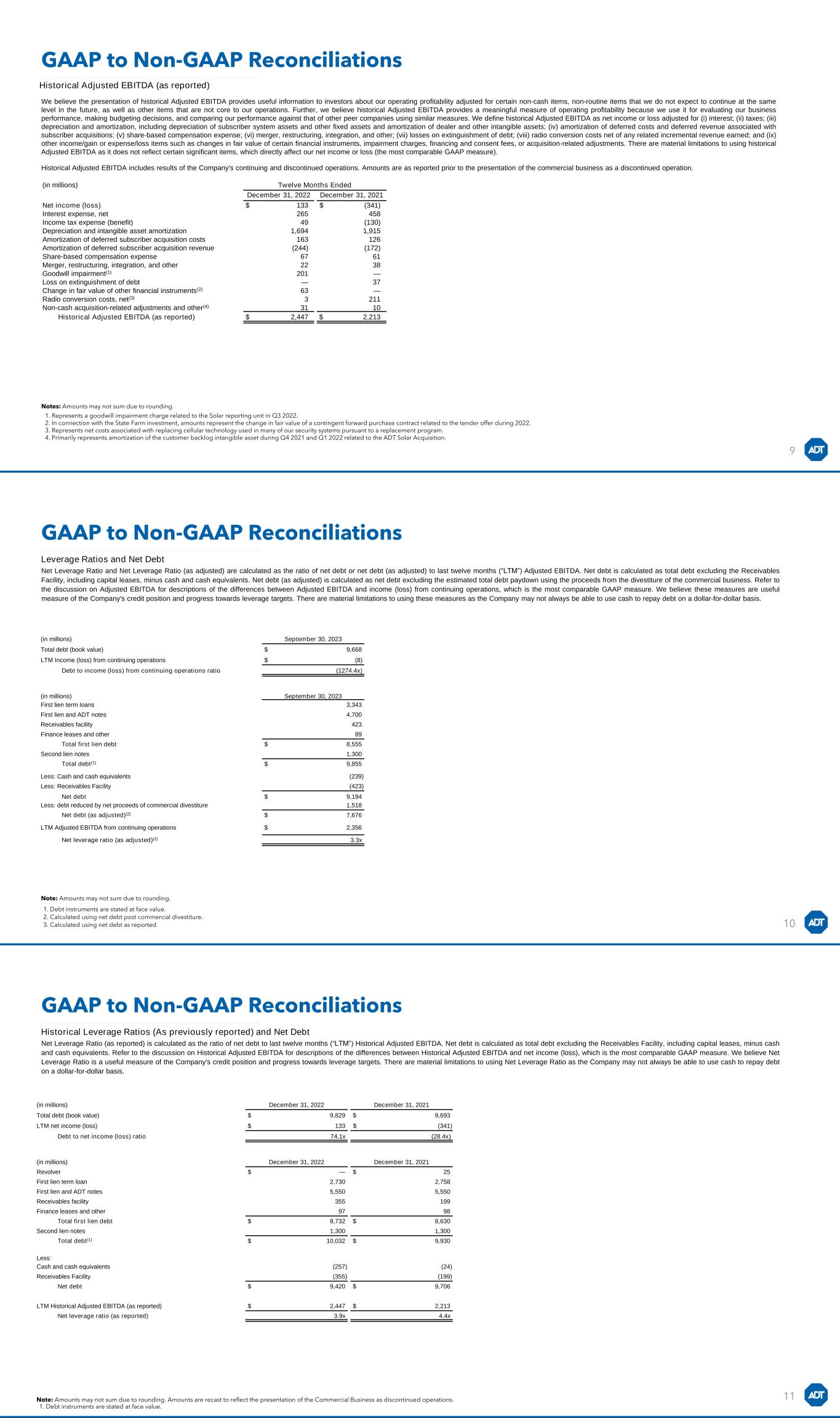 (in millions) Twelve Months Ended December 31, 2022 December 31, 2021 Net income (loss) $ 133 $ (341) Interest expense, net 265 458 Income tax expense (benefit) 49 (130) Depreciation and intangible asset amortization 1,694 1,915 Amortization of deferred subscriber acquisition costs 163 126 Amortization of deferred subscriber acquisition revenue (244) (172) Share-based compensation expense 67 61 Merger, restructuring, integration, and other 22 38 Goodwill impairment(1) 201 — Loss on extinguishment of debt — 37 Change in fair value of other financial instruments(2) 63 — Radio conversion costs, net(3) 3 211 Non-cash acquisition-related adjustments and other(4) 31 10 Historical Adjusted EBITDA (as reported) $ 2,447 $ 2,213 Historical Adjusted EBITDA (as reported) We believe the presentation of historical Adjusted EBITDA provides useful information to investors about our operating profitability adjusted for certain non-cash items, non-routine items that we do not expect to continue at the same level in the future, as well as other items that are not core to our operations. Further, we believe historical Adjusted EBITDA provides a meaningful measure of operating profitability because we use it for evaluating our business performance, making budgeting decisions, and comparing our performance against that of other peer companies using similar measures. We define historical Adjusted EBITDA as net income or loss adjusted for (i) interest; (ii) taxes; (iii) depreciation and amortization, including depreciation of subscriber system assets and other fixed assets and amortization of dealer and other intangible assets; (iv) amortization of deferred costs and deferred revenue associated with subscriber acquisitions; (v) share-based compensation expense; (vi) merger, restructuring, integration, and other; (vii) losses on extinguishment of debt; (viii) radio conversion costs net of any related incremental revenue earned; and (ix) other income/gain or expense/loss items such as changes in fair value of certain financial instruments, impairment charges, financing and consent fees, or acquisition-related adjustments. There are material limitations to using historical Adjusted EBITDA as it does not reflect certain significant items, which directly affect our net income or loss (the most comparable GAAP measure). Historical Adjusted EBITDA includes results of the Company's continuing and discontinued operations. Amounts are as reported prior to the presentation of the commercial business as a discontinued operation. Notes: Amounts may not sum due to rounding. 1. Represents a goodwill impairment charge related to the Solar reporting unit in Q3 2022. 2. In connection with the State Farm investment, amounts represent the change in fair value of a contingent forward purchase contract related to the tender offer during 2022. 3. Represents net costs associated with replacing cellular technology used in many of our security systems pursuant to a replacement program. 4. Primarily represents amortization of the customer backlog intangible asset during Q4 2021 and Q1 2022 related to the ADT Solar Acquisition. 9 GAAP to Non-GAAP Reconciliations GAAP to Non-GAAP Reconciliations Net Leverage Ratio and Net Leverage Ratio (as adjusted) are calculated as the ratio of net debt or net debt (as adjusted) to last twelve months (“LTM”) Adjusted EBITDA. Net debt is calculated as total debt excluding the Receivables Facility, including capital leases, minus cash and cash equivalents. Net debt (as adjusted) is calculated as net debt excluding the estimated total debt paydown using the proceeds from the divestiture of the commercial business. Refer to the discussion on Adjusted EBITDA for descriptions of the differences between Adjusted EBITDA and income (loss) from continuing operations, which is the most comparable GAAP measure. We believe these measures are useful measure of the Company's credit position and progress towards leverage targets. There are material limitations to using these measures as the Company may not always be able to use cash to repay debt on a dollar-for-dollar basis. 1. Debt instruments are stated at face value. 2. Calculated using net debt post commercial divestiture. 3. Calculated using net debt as reported. (in millions) September 30, 2023 Total debt (book value) $ 9,668 LTM Income (loss) from continuing operations $ (8) Debt to income (loss) from continuing operations ratio (1274.4x) (in millions) September 30, 2023 First lien term loans 3,343 First lien and ADT notes 4,700 Receivables facility 423 Finance leases and other 89 Total first lien debt $ 8,555 Second lien notes 1,300 Total debt(1) $ 9,855 Less: Cash and cash equivalents (239) Less: Receivables Facility (423) Net debt $ 9,194 Less: debt reduced by net proceeds of commercial divestiture 1,518 Net debt (as adjusted)(2) $ 7,676 LTM Adjusted EBITDA from continuing operations $ 2,356 Net leverage ratio (as adjusted)(2) 3.3x Note: Amounts may not sum due to rounding. 10 Leverage Ratios and Net Debt GAAP to Non-GAAP Reconciliations 1. Debt instruments are stated at face value. (in millions) December 31, 2022 December 31, 2021 Total debt (book value) $ 9,829 $ 9,693 LTM net income (loss) $ 133 $ (341) Debt to net income (loss) ratio 74.1x (28.4x) Net Leverage Ratio (as reported) is calculated as the ratio of net debt to last twelve months (“LTM”) Historical Adjusted EBITDA. Net debt is calculated as total debt excluding the Receivables Facility, including capital leases, minus cash and cash equivalents. Refer to the discussion on Historical Adjusted EBITDA for descriptions of the differences between Historical Adjusted EBITDA and net income (loss), which is the most comparable GAAP measure. We believe Net Leverage Ratio is a useful measure of the Company's credit position and progress towards leverage targets. There are material limitations to using Net Leverage Ratio as the Company may not always be able to use cash to repay debt on a dol