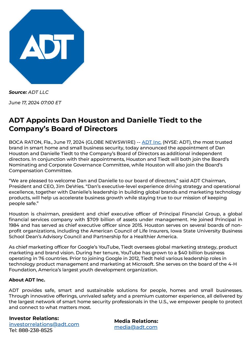 Source: ADT LLC June 17, 2024 07:00 ET ADT Appoints Dan Houston and Danielle Tiedt to the Company’s Board of Directors BOCA RATON, Fla., June 17, 2024 (GLOBE NEWSWIRE) -- ADT Inc. (NYSE: ADT), the most trusted brand in smart home and small business security, today announced the appointment of Dan Houston and Danielle Tiedt to the Company’s Board of Directors as additional independent directors. In conjunction with their appointments, Houston and Tiedt will both join the Board’s Nominating and Corporate Governance Committee, while Houston will also join the Board’s Compensation Committee. “We are pleased to welcome Dan and Danielle to our board of directors,” said ADT Chairman, President and CEO, Jim DeVries. “Dan’s executive-level experience driving strategy and operational excellence, together with Danielle’s leadership in building global brands and marketing technology products, will help us accelerate business growth while staying true to our mission of keeping people safe.” Houston is chairman, president and chief executive of�cer of Principal Financial Group, a global �nancial services company with $709 billion of assets under management. He joined Principal in 1984 and has served as chief executive of�cer since 2015. Houston serves on several boards of non- pro�t organizations, including the American Council of Life Insurers, Iowa State University Business School Dean’s Advisory Council and Partnership for a Healthier America. As chief marketing of�cer for Google’s YouTube, Tiedt oversees global marketing strategy, product marketing and brand vision. During her tenure, YouTube has grown to a $40 billion business operating in 76 countries. Prior to joining Google in 2012, Tiedt held various leadership roles in technology product management and marketing at Microsoft. She serves on the board of the 4-H Foundation, America’s largest youth development organization. About ADT Inc.  ADT provides safe, smart and sustainable solutions for people, homes and small businesses. Through innovative offerings, unrivaled safety and a premium customer experience, all delivered by the largest network of smart home security professionals in the U.S., we empower people to protect and connect to what matters most. Investor Relations: investorrelations@adt.com Tel: 888-238-8525 Media Relations: media@adt.com