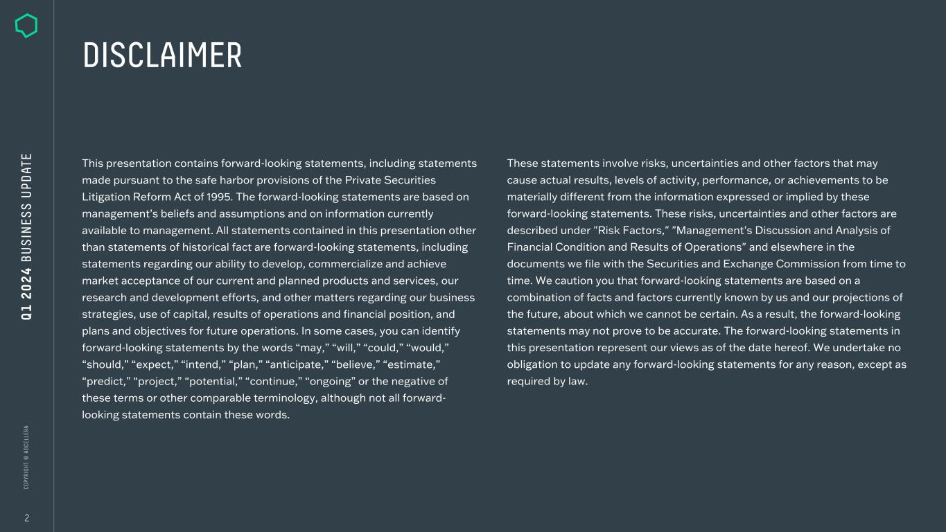 C O PY RI G H T © A B C EL LE RA DISCLAIMER 2 This presentation contains forward-looking statements, including statements made pursuant to the safe harbor provisions of the Private Securities Litigation Reform Act of 1995. The forward-looking statements are based on management’s beliefs and assumptions and on information currently available to management. All statements contained in this presentation other than statements of historical fact are forward-looking statements, including statements regarding our ability to develop, commercialize and achieve market acceptance of our current and planned products and services, our research and development efforts, and other matters regarding our business strategies, use of capital, results of operations and financial position, and plans and objectives for future operations. In some cases, you can identify forward-looking statements by the words “may,” “will,” “could,” “would,” “should,” “expect,” “intend,” “plan,” “anticipate,” “believe,” “estimate,” “predict,” “project,” “potential,” “continue,” “ongoing” or the negative of these terms or other comparable terminology, although not all forward- looking statements contain these words. These statements involve risks, uncertainties and other factors that may cause actual results, levels of activity, performance, or achievements to be materially different from the information expressed or implied by these forward-looking statements. These risks, uncertainties and other factors are described under "Risk Factors," "Management's Discussion and Analysis of Financial Condition and Results of Operations" and elsewhere in the documents we file with the Securities and Exchange Commission from time to time. We caution you that forward-looking statements are based on a combination of facts and factors currently known by us and our projections of the future, about which we cannot be certain. As a result, the forward-looking statements may not prove to be accurate. The forward-looking statements in this presentation represent our views as of the date hereof. We undertake no obligation to update any forward-looking statements for any reason, except as required by law. Q 1 2 0 2 4 B U S IN ES S U PD AT E