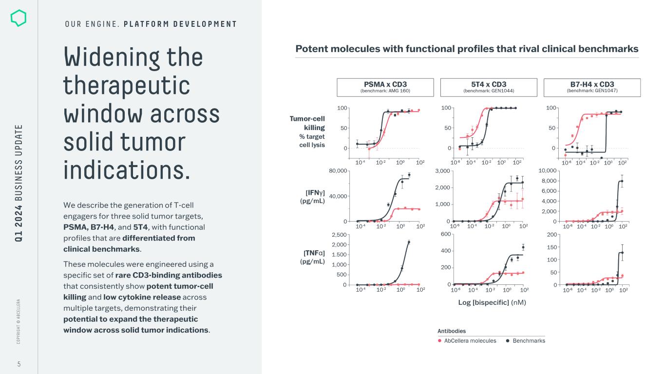 C O PY RI G H T © A B C EL LE RA C O PY RI G H T © A B C EL LE RA 4 New data demonstrates highly differentiated T-cell engager platform. O U R E N G I N E . P L A T F O R M D E V E L O P M E N T Q 1 2 0 2 4 B U S IN ES S U PD AT E Presented at AACR 2024