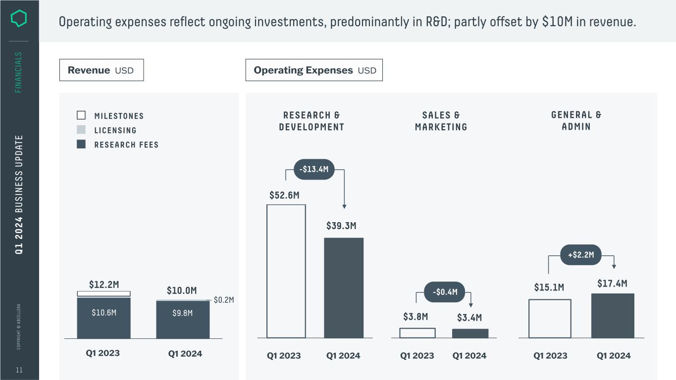 C O PY RI G H T © A B C EL LE RA 11 FI N A N CI A LS RESEARCH & DEVELOPMENT SALES & MARKETING GENERAL & ADMIN Operating Expenses USD Q1 2023 Q1 2024 $3.8M $3.4M Q1 2023 Q1 2024 $52.6M $39.3M -$13.4M Q 1 2 0 2 4 B U S IN ES S U PD AT E MILESTONES LICENSING RESEARCH FEES Revenue USD $0.2M $10.6M $9.8M Q1 2023 $12.2M $10.0M Q1 2024 Operating expenses reflect ongoing investments, predominantly in R&D; partly offset by $10M in revenue. -$0.4M Q1 2023 Q1 2024 +$2.2M $15.1M $17.4M