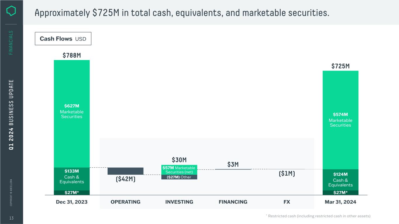 C O PY RI G H T © A B C EL LE RA 12 FI N A N CI A LS Net loss of $41M; equivalent to ($0.14) per share (basic & diluted). NET EARNINGS EARNINGS PER SHARE: BASIC AND DILUTED Q1 2023 Q1 2024 -$40.1M -$40.6M -$0.14 -$0.14 Q1 2023 Q1 2024 Q 1 2 0 2 4 B U S IN ES S U PD AT E Earnings USD