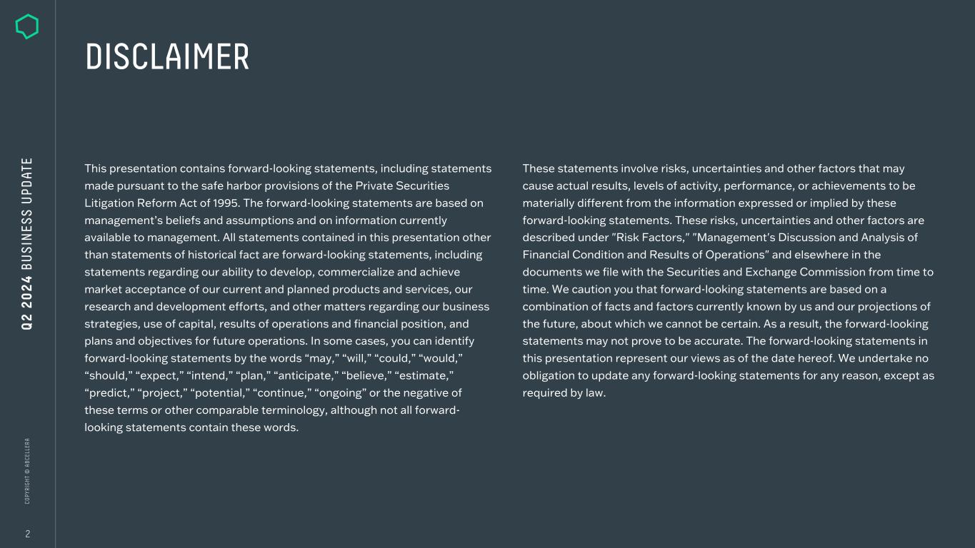 C O PY R IG H T © A B C EL LE R A DISCLAIMER 2 This presentation contains forward-looking statements, including statements made pursuant to the safe harbor provisions of the Private Securities Litigation Reform Act of 1995. The forward-looking statements are based on management’s beliefs and assumptions and on information currently available to management. All statements contained in this presentation other than statements of historical fact are forward-looking statements, including statements regarding our ability to develop, commercialize and achieve market acceptance of our current and planned products and services, our research and development efforts, and other matters regarding our business strategies, use of capital, results of operations and financial position, and plans and objectives for future operations. In some cases, you can identify forward-looking statements by the words “may,” “will,” “could,” “would,” “should,” “expect,” “intend,” “plan,” “anticipate,” “believe,” “estimate,” “predict,” “project,” “potential,” “continue,” “ongoing” or the negative of these terms or other comparable terminology, although not all forward- looking statements contain these words. These statements involve risks, uncertainties and other factors that may cause actual results, levels of activity, performance, or achievements to be materially different from the information expressed or implied by these forward-looking statements. These risks, uncertainties and other factors are described under "Risk Factors," "Management's Discussion and Analysis of Financial Condition and Results of Operations" and elsewhere in the documents we file with the Securities and Exchange Commission from time to time. We caution you that forward-looking statements are based on a combination of facts and factors currently known by us and our projections of the future, about which we cannot be certain. As a result, the forward-looking statements may not prove to be accurate. The forward-looking statements in this presentation represent our views as of the date hereof. We undertake no obligation to update any forward-looking statements for any reason, except as required by law. Q 2 2 0 2 4 B U S IN ES S U PD AT E