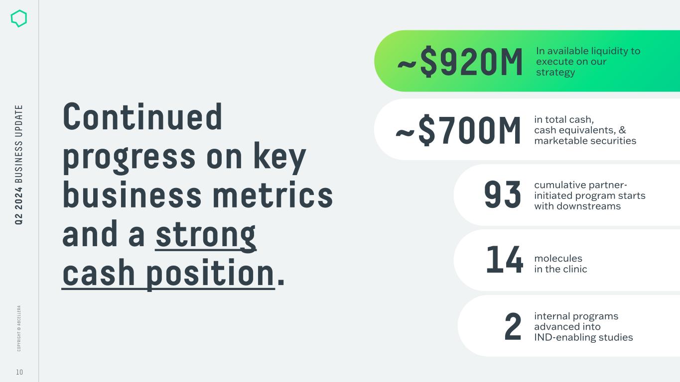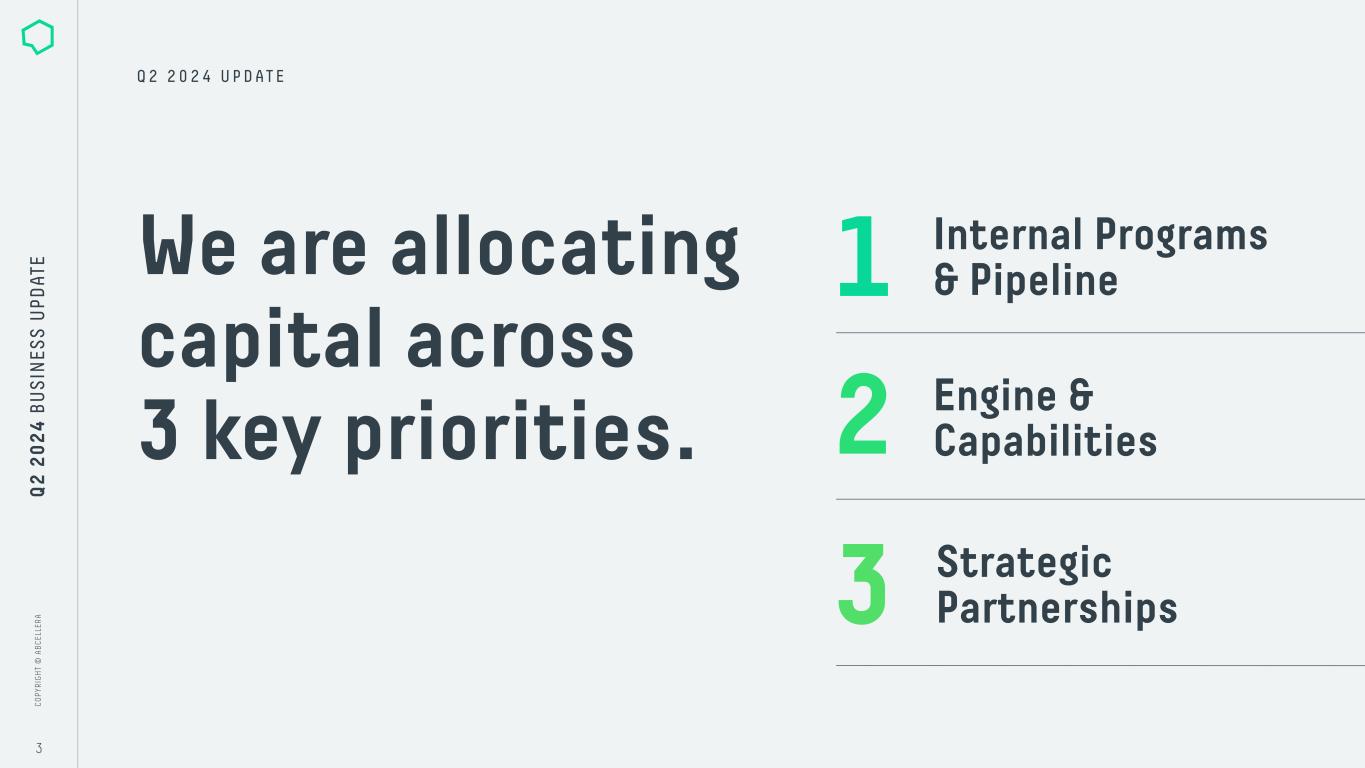 C O PY R IG H T © A B C EL LE R A C O PY R IG H T © A B C EL LE R A 3 Q 2 2 0 2 4 B U S IN ES S U PD AT E We are allocating capital across 3 key priorities. Q 2 2 0 2 4 U P D A T E Engine & Capabilities Strategic Partnerships Internal Programs & Pipeline1 2 3