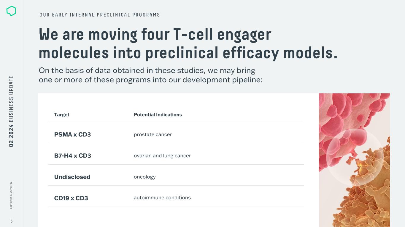C O PY R IG H T © A B C EL LE R A C O PY R IG H T © A B C EL LE R A 4 ABCL635 & ABCL575 are on track for clinical trial applications in Q2 2025. O U R P I P E L I N E Q 2 2 0 2 4 B U S IN ES S U PD AT E Molecule Target Indication Therapeutic Area Potential Differentiation ABCL635 undisclosed GPCR or ion channel undisclosed metabolic & endocrine conditions first in class ABCL575 OX40L atopic dermatitis immunology & inflammation best in class