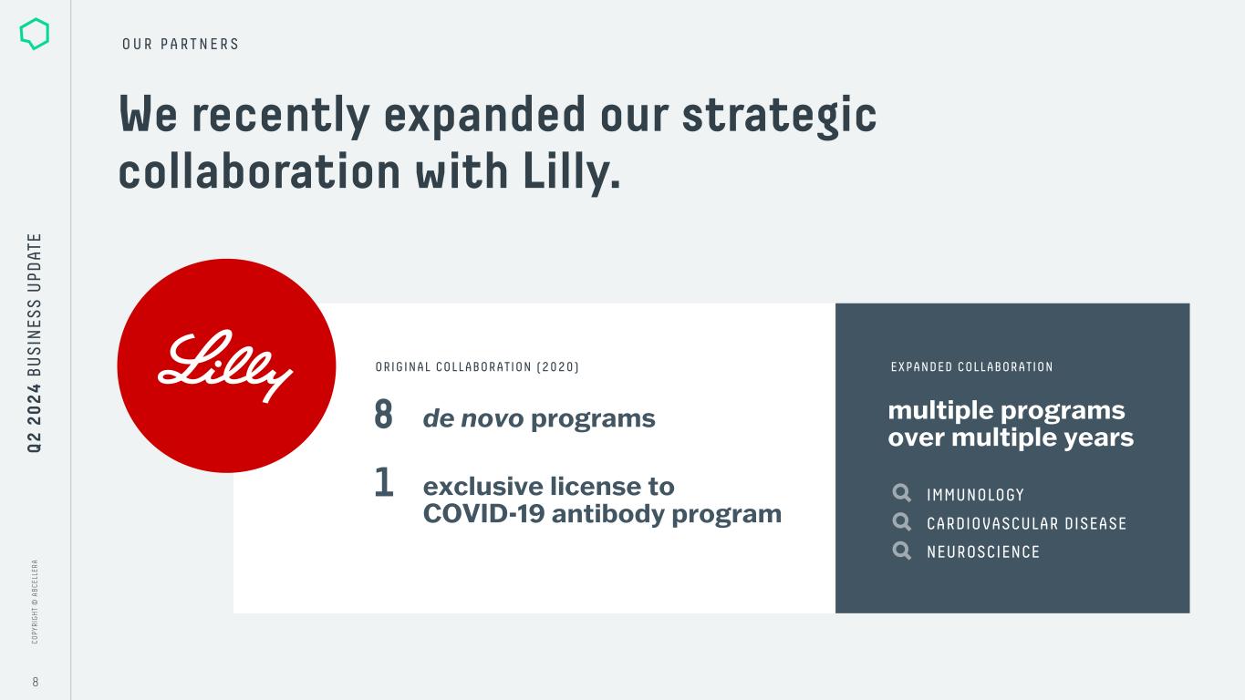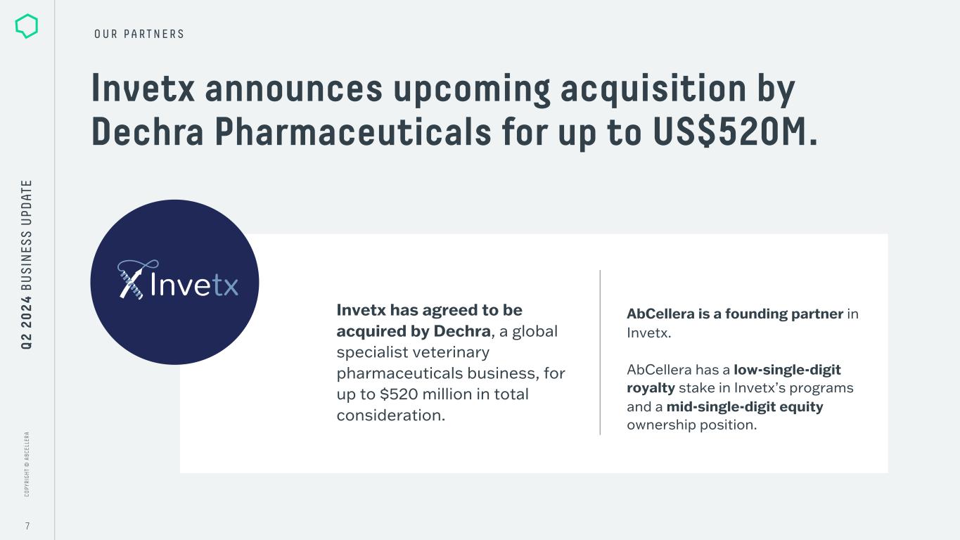 C O PY R IG H T © A B C EL LE R A C O PY R IG H T © A B C EL LE R A 7 O U R P A R T N E R S Q 2 2 0 2 4 B U S IN ES S U PD AT E Invetx announces upcoming acquisition by Dechra Pharmaceuticals for up to US$520M. Invetx has agreed to be acquired by Dechra, a global specialist veterinary pharmaceuticals business, for up to $520 million in total consideration. AbCellera is a founding partner in Invetx. AbCellera has a low-single-digit royalty stake in Invetx’s programs and a mid-single-digit equity ownership position.