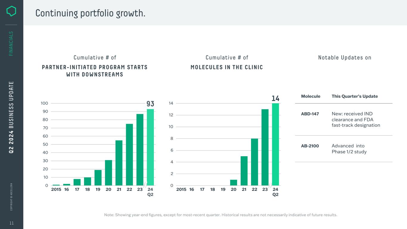 C O PY R IG H T © A B C EL LE R A C O PY R IG H T © A B C EL LE R A 10 Q 2 2 0 2 4 B U S IN ES S U PD AT E Continued progress on key business metrics and a strong cash position. in total cash, cash equivalents, & marketable securities cumulative partner- initiated program starts with downstreams internal programs advanced into IND-enabling studies ~$700M 93 2 molecules in the clinic14 In available liquidity to execute on our strategy~$920M