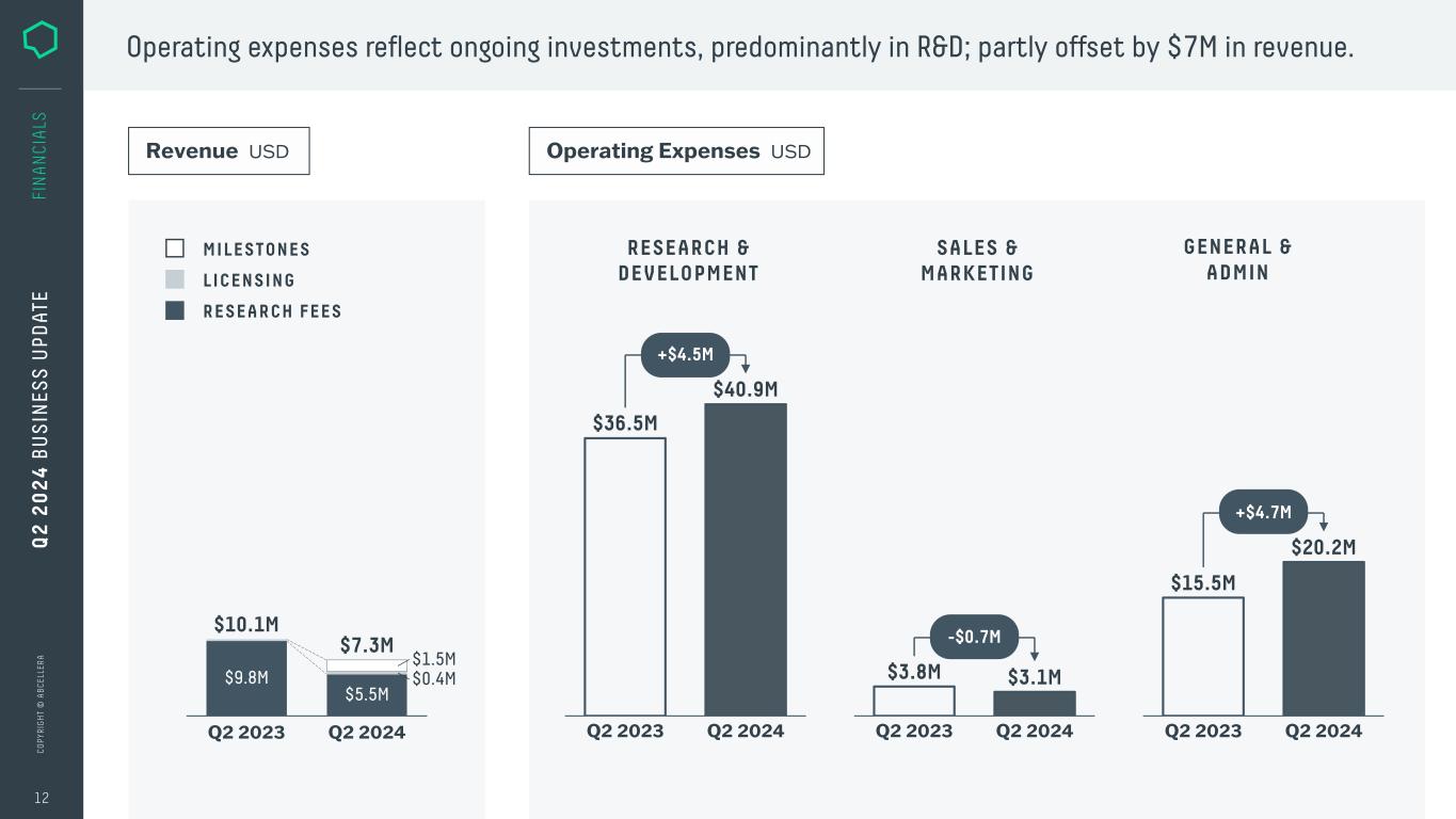 C O PY R IG H T © A B C EL LE R A 14 2 4 6 8 10 12 14 0 19 20 21 22 23 24 Q2 17162015 18 0 10 20 30 40 50 60 70 80 90 100 18 19 20 21 22 23 24 Q2 17162015 93 PARTNER-INITIATED PROGRAM STARTS WITH DOWNSTREAMS Continuing portfolio growth. 11 FI N A N CI A LS Cumulative # of Q 2 2 0 2 4 B U S IN ES S U PD AT E MOLECULES IN THE CLINIC Cumulative # of Notable Updates on Molecule This Quarter’s Update ABD-147 New: received IND clearance and FDA fast-track designation AB-2100 Advanced into Phase 1/2 study