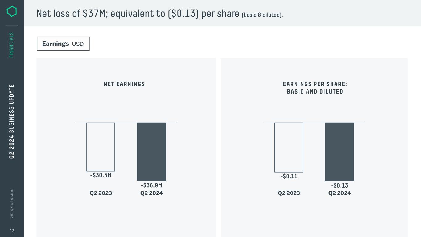 C O PY R IG H T © A B C EL LE R A Q2 2024Q2 2023 $36.5M $40.9M +$4.5M Q2 2024Q2 2023 $3.8M $3.1M -$0.7M Q2 2024Q2 2023 $15.5M $20.2M +$4.7M 12 FI N A N CI A LS RESEARCH & DEVELOPMENT SALES & MARKETING GENERAL & ADMIN Operating Expenses USD Q 2 2 0 2 4 B U S IN ES S U PD AT E MILESTONES LICENSING RESEARCH FEES Revenue USD Operating expenses reflect ongoing investments, predominantly in R&D; partly offset by $7M in revenue. $1.5M $0.4M Q2 2024 $10.1M $7.3M $5.5M Q2 2023 $9.8M