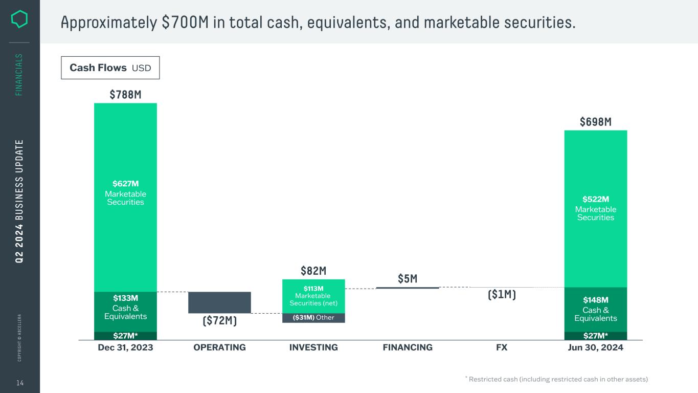 C O PY R IG H T © A B C EL LE R A 13 FI N A N CI A LS Net loss of $37M; equivalent to ($0.13) per share (basic & diluted). NET EARNINGS EARNINGS PER SHARE: BASIC AND DILUTED Q2 2023 Q2 2024 -$30.5M -$36.9M -$0.11 -$0.13 Q2 2023 Q2 2024 Q 2 2 0 2 4 B U S IN ES S U PD AT E Earnings USD
