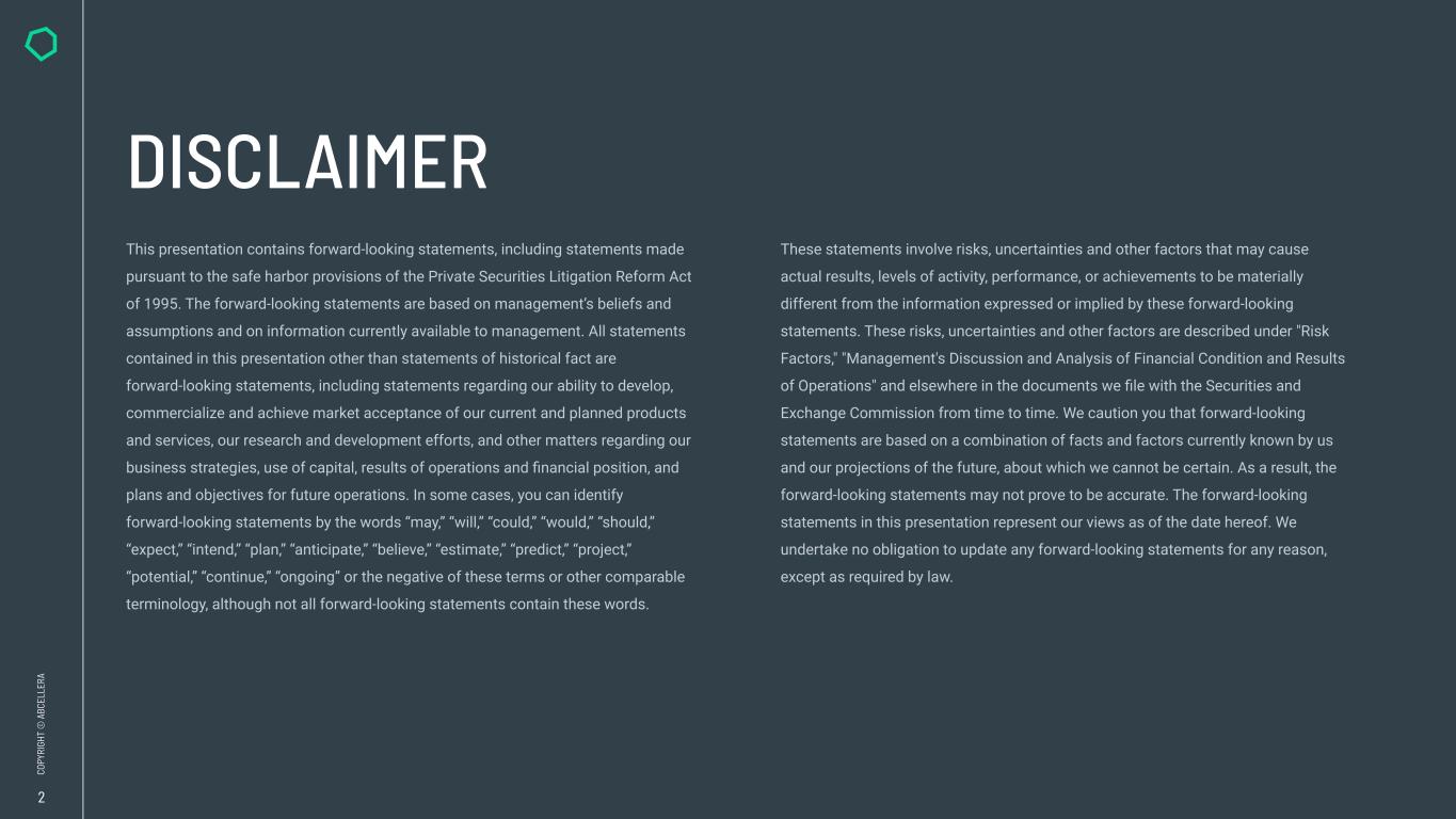 These statements involve risks, uncertainties and other factors that may cause actual results, levels of activity, performance, or achievements to be materially different from the information expressed or implied by these forward-looking statements. These risks, uncertainties and other factors are described under "Risk Factors," "Management's Discussion and Analysis of Financial Condition and Results of Operations" and elsewhere in the documents we file with the Securities and Exchange Commission from time to time. We caution you that forward-looking statements are based on a combination of facts and factors currently known by us and our projections of the future, about which we cannot be certain. As a result, the forward-looking statements may not prove to be accurate. The forward-looking statements in this presentation represent our views as of the date hereof. We undertake no obligation to update any forward-looking statements for any reason, except as required by law. DISCLAIMER This presentation contains forward-looking statements, including statements made pursuant to the safe harbor provisions of the Private Securities Litigation Reform Act of 1995. The forward-looking statements are based on management’s beliefs and assumptions and on information currently available to management. All statements contained in this presentation other than statements of historical fact are forward-looking statements, including statements regarding our ability to develop, commercialize and achieve market acceptance of our current and planned products and services, our research and development efforts, and other matters regarding our business strategies, use of capital, results of operations and financial position, and plans and objectives for future operations. In some cases, you can identify forward-looking statements by the words “may,” “will,” “could,” “would,” “should,” “expect,” “intend,” “plan,” “anticipate,” “believe,” “estimate,” “predict,” “project,” “potential,” “continue,” “ongoing” or the negative of these terms or other comparable terminology, although not all forward-looking statements contain these words. 2 CO PY RI GH T © A BC EL LE RA