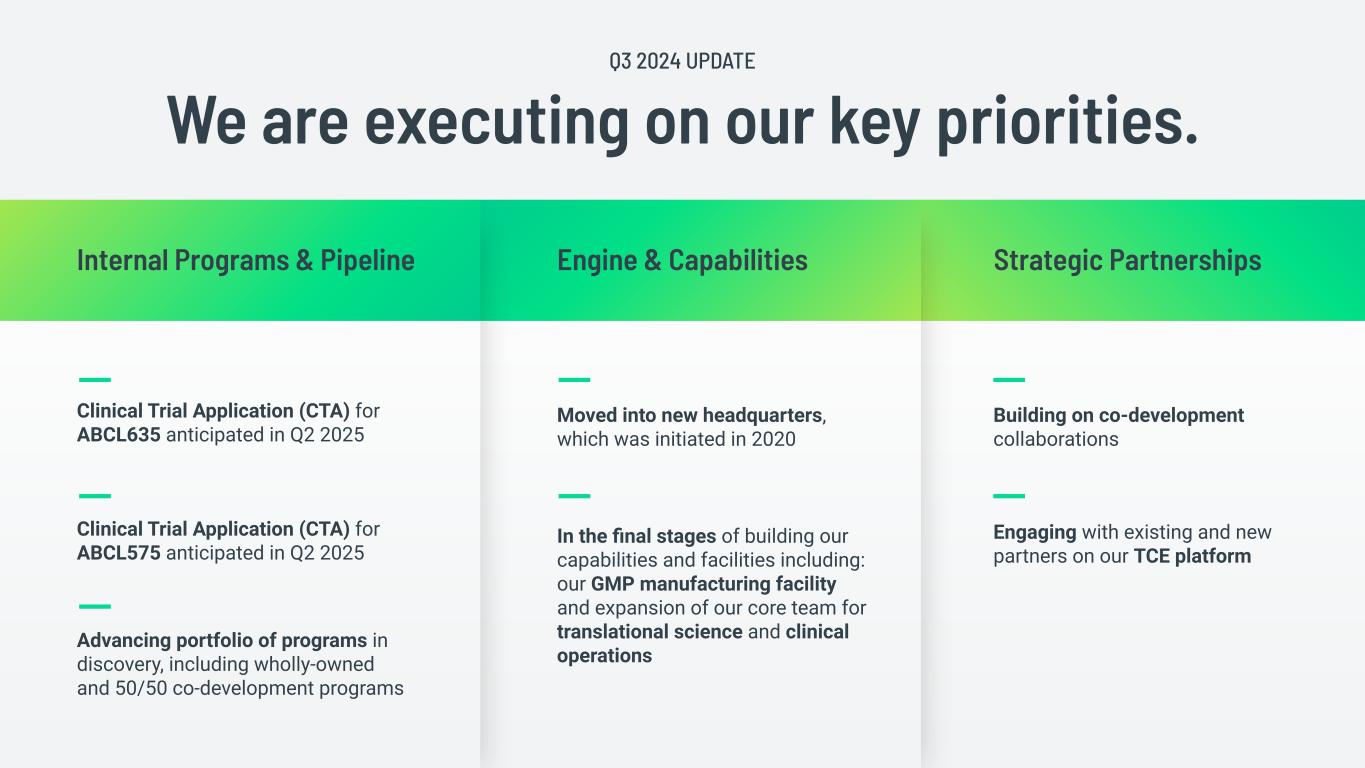 Q3 2024 UPDATE We are executing on our key priorities. Strategic Partnerships Building on co-development collaborations Moved into new headquarters, which was initiated in 2020 Engine & Capabilities Clinical Trial Application (CTA) for ABCL635 anticipated in Q2 2025 Internal Programs & Pipeline Clinical Trial Application (CTA) for ABCL575 anticipated in Q2 2025 Advancing portfolio of programs in discovery, including wholly-owned and 50/50 co-development programs In the final stages of building our capabilities and facilities including: our GMP manufacturing facility and expansion of our core team for translational science and clinical operations Engaging with existing and new partners on our TCE platform