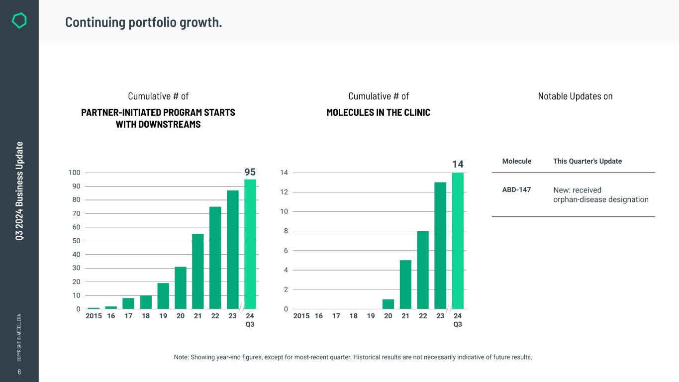 5 CO PY RI GH T © A BC EL LE RA Q3 2 02 4 Bu si ne ss U pd at e in total cash, cash equivalents, & marketable securities cumulative partner-initiated program starts with downstreams internal programs advanced into IND-enabling studies ~$670M 95 2 molecules in the clinic14 in available liquidity to execute on our strategy~$875M Continued progress on key business metrics and a strong cash position. Draft. Master in separate Financial Slides file. Draft.