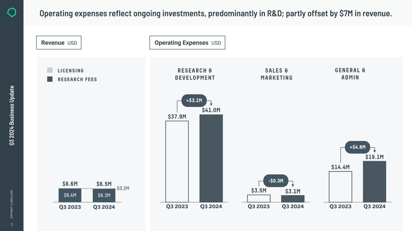 7 CO PY RI GH T © A BC EL LE RA Q3 2 02 4 Bu si ne ss U pd at e Operating expenses reflect ongoing investments, predominantly in R&D; partly offset by $7M in revenue. Operating Expenses USDRevenue USD Post-production ❑ Move “Q” labels down Draft. Master in separate Financial Slides file.