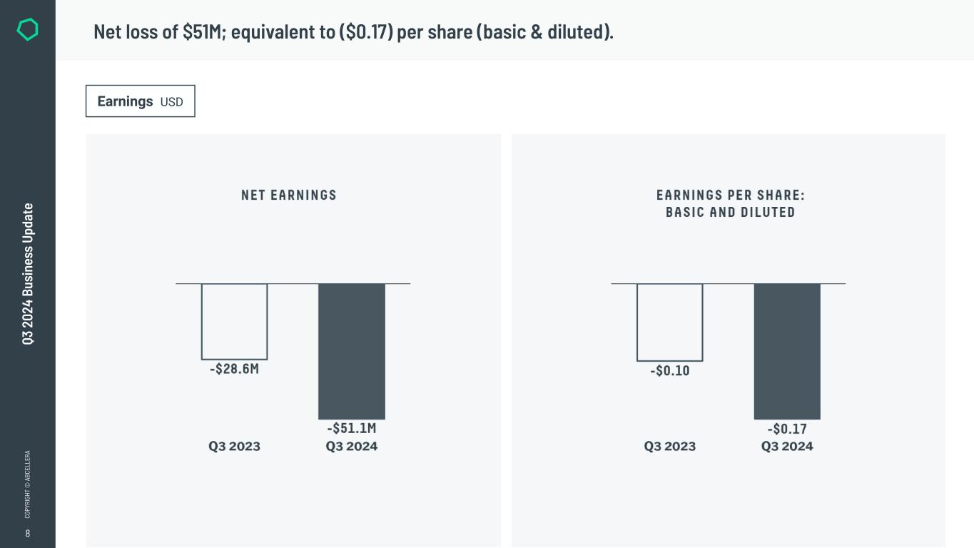 8 CO PY RI GH T © A BC EL LE RA Q3 2 02 4 Bu si ne ss U pd at e Net loss of $51M; equivalent to ($0.17) per share (basic & diluted). Earnings USD Post-production ❑ Move “Q” labels down Draft. Master in separate Financial Slides file.