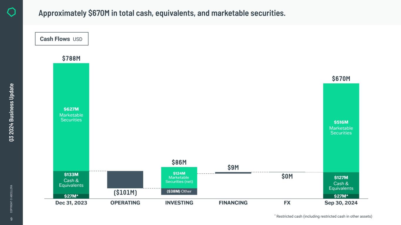 9 CO PY RI GH T © A BC EL LE RA Q3 2 02 4 Bu si ne ss U pd at e Approximately $670M in total cash, equivalents, and marketable securities. Cash Flows USD * Restricted cash (including restricted cash in other assets) Post-production ❑ Fit labels in segments where possible Draft. Master in separate Financial Slides file.